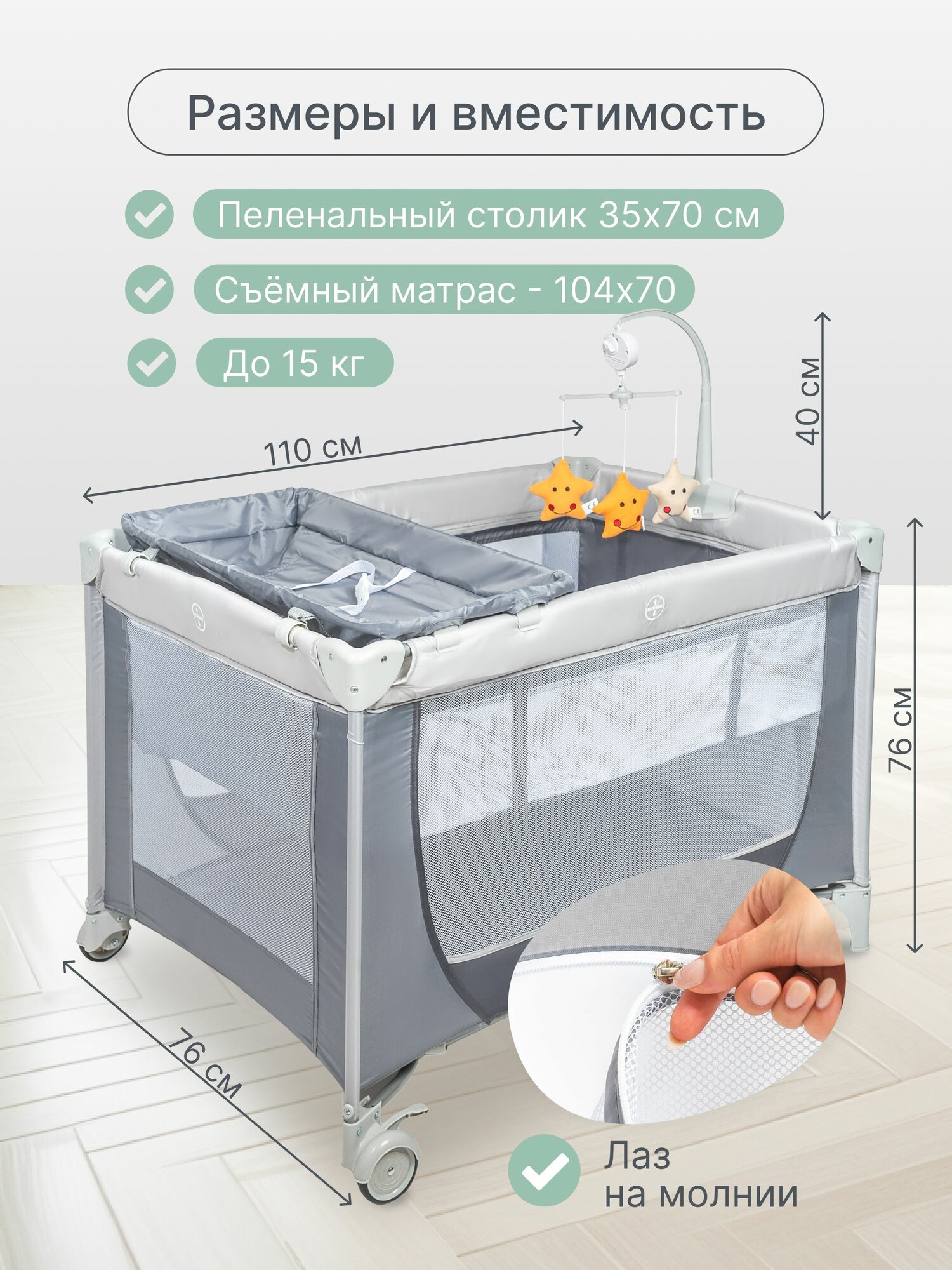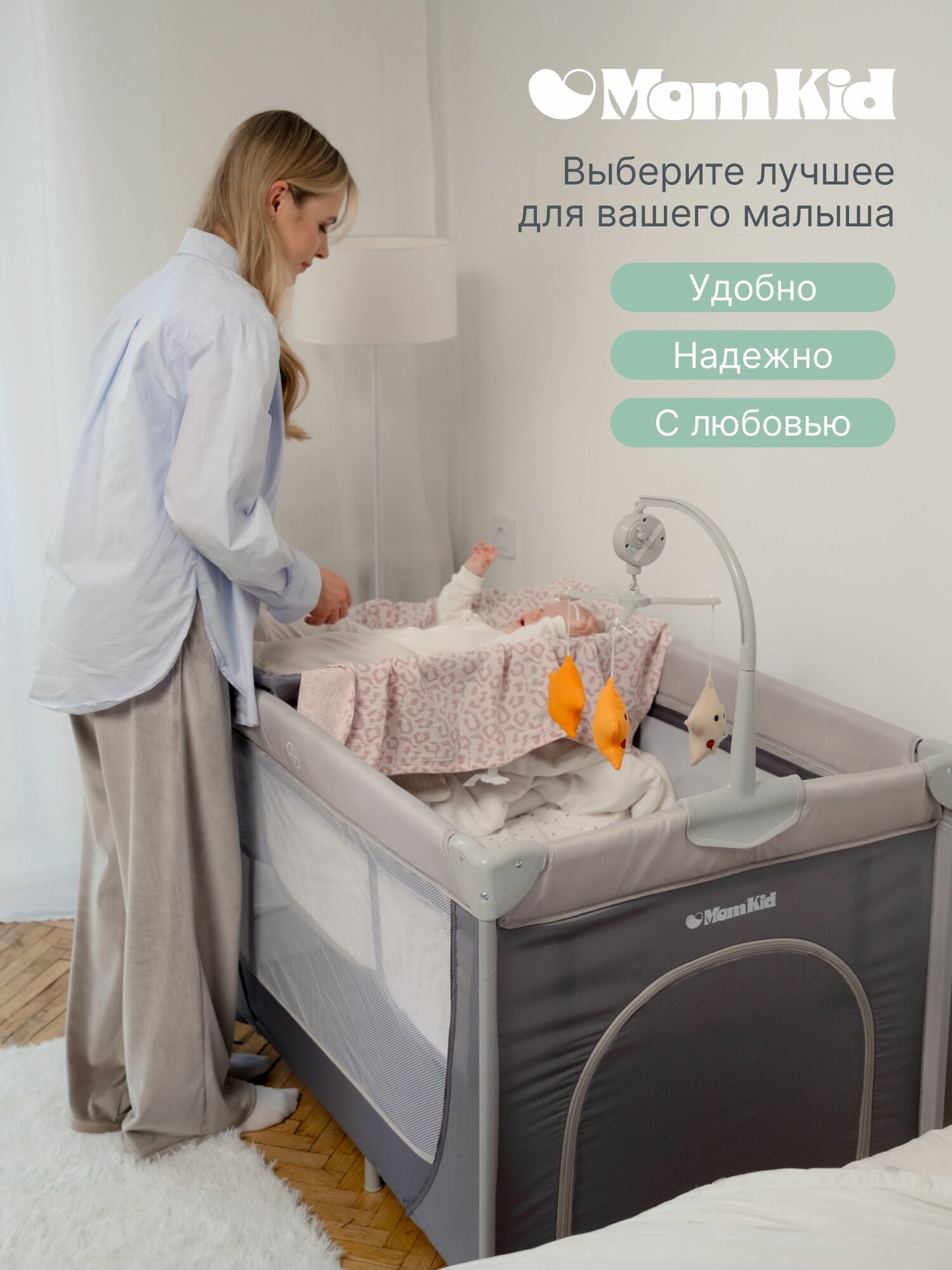 Купить Манеж кровать детский складной MOMKID для малышей и новорожденных с матрасом, пеленальным столиком и мобилем, 2 уровня, серый