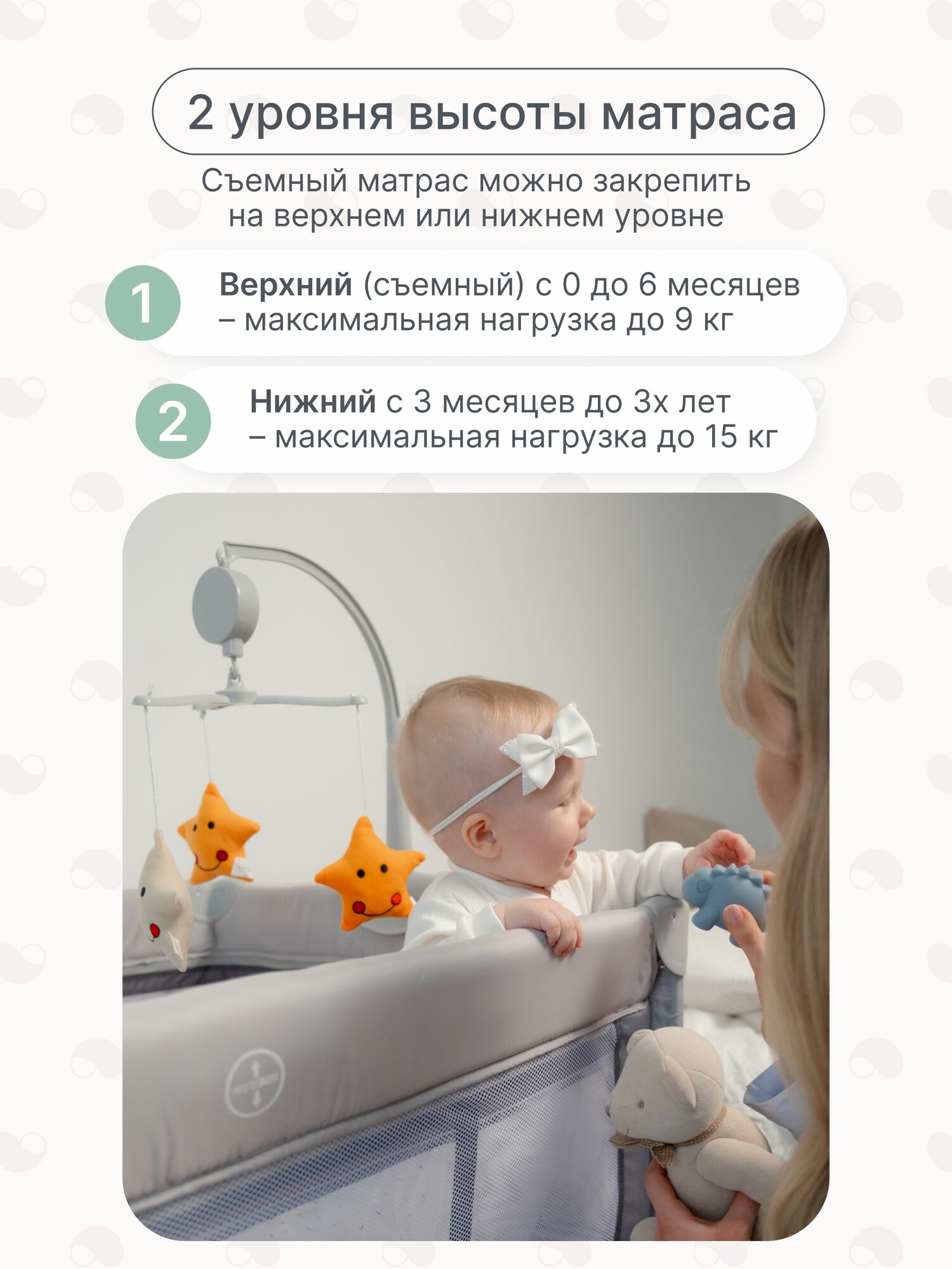СохранитьМанеж кровать детский складной MOMKID для малышей и новорожденных с матрасом, пеленальным столиком и мобилем, 2 уровня, серый интересное: