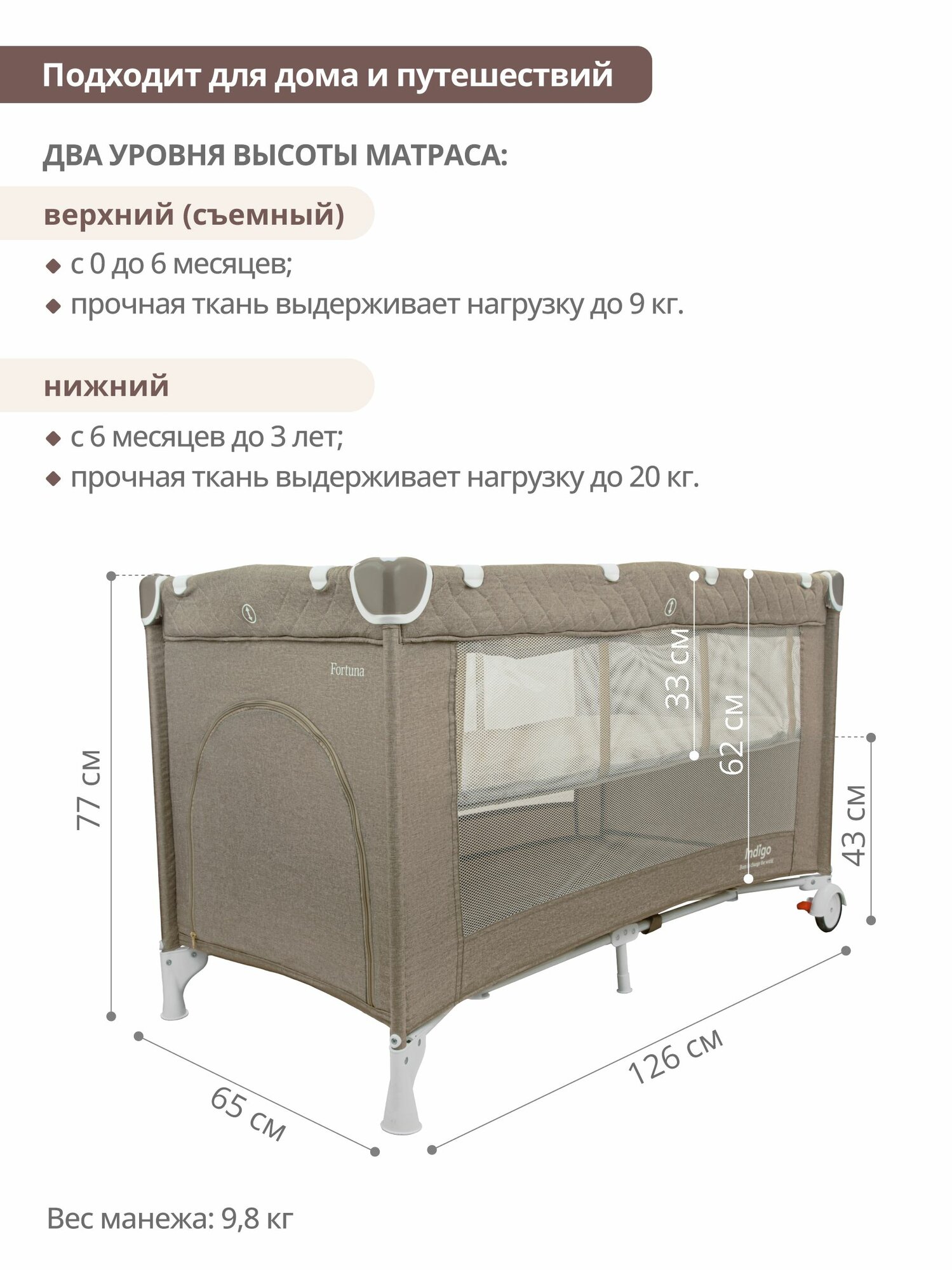 Манеж кровать детский Indigo Fortuna, для новорожденных, с матрасом и москитной сеткой, складной, 2 уровня, бежевый интересное: