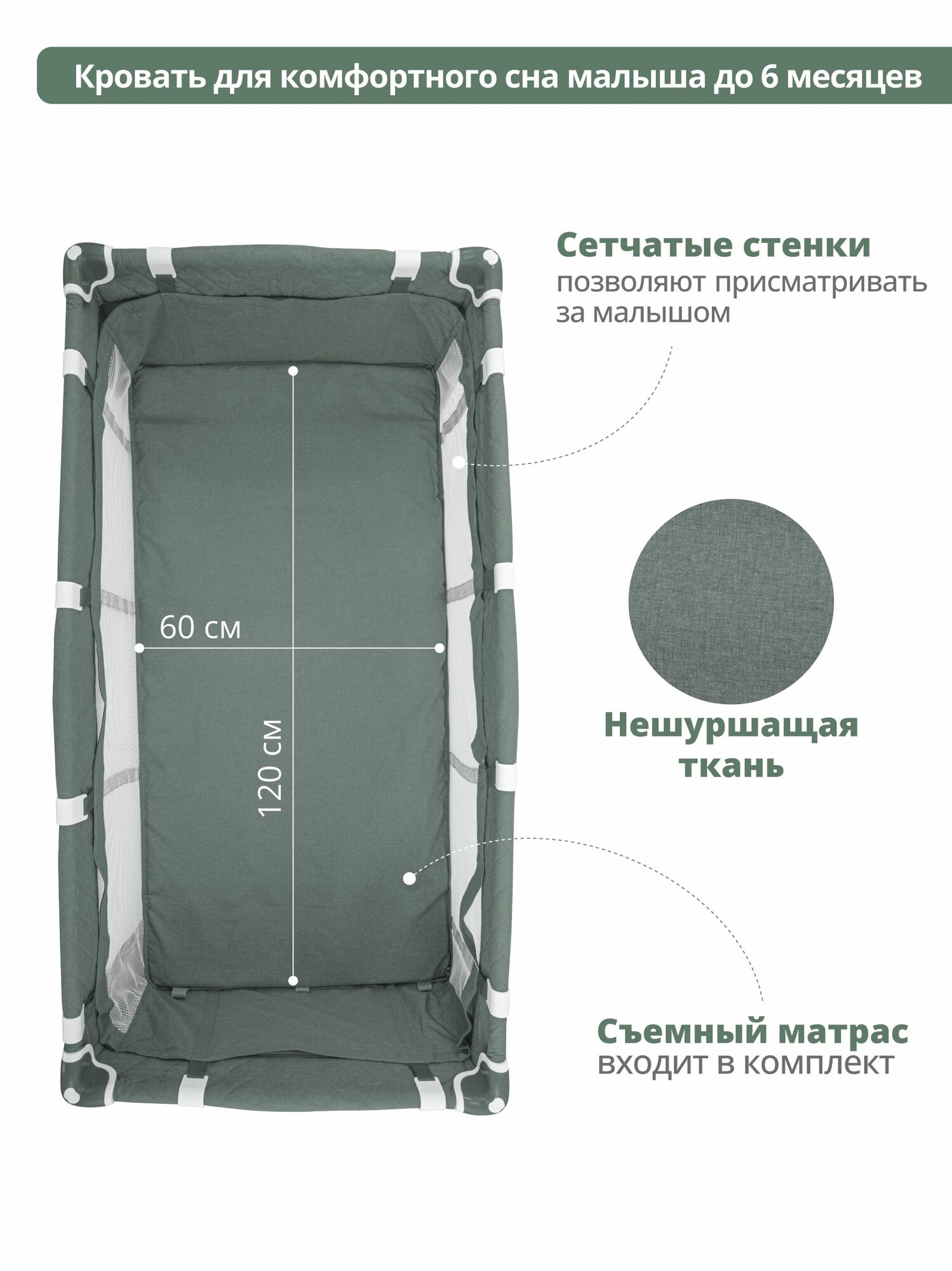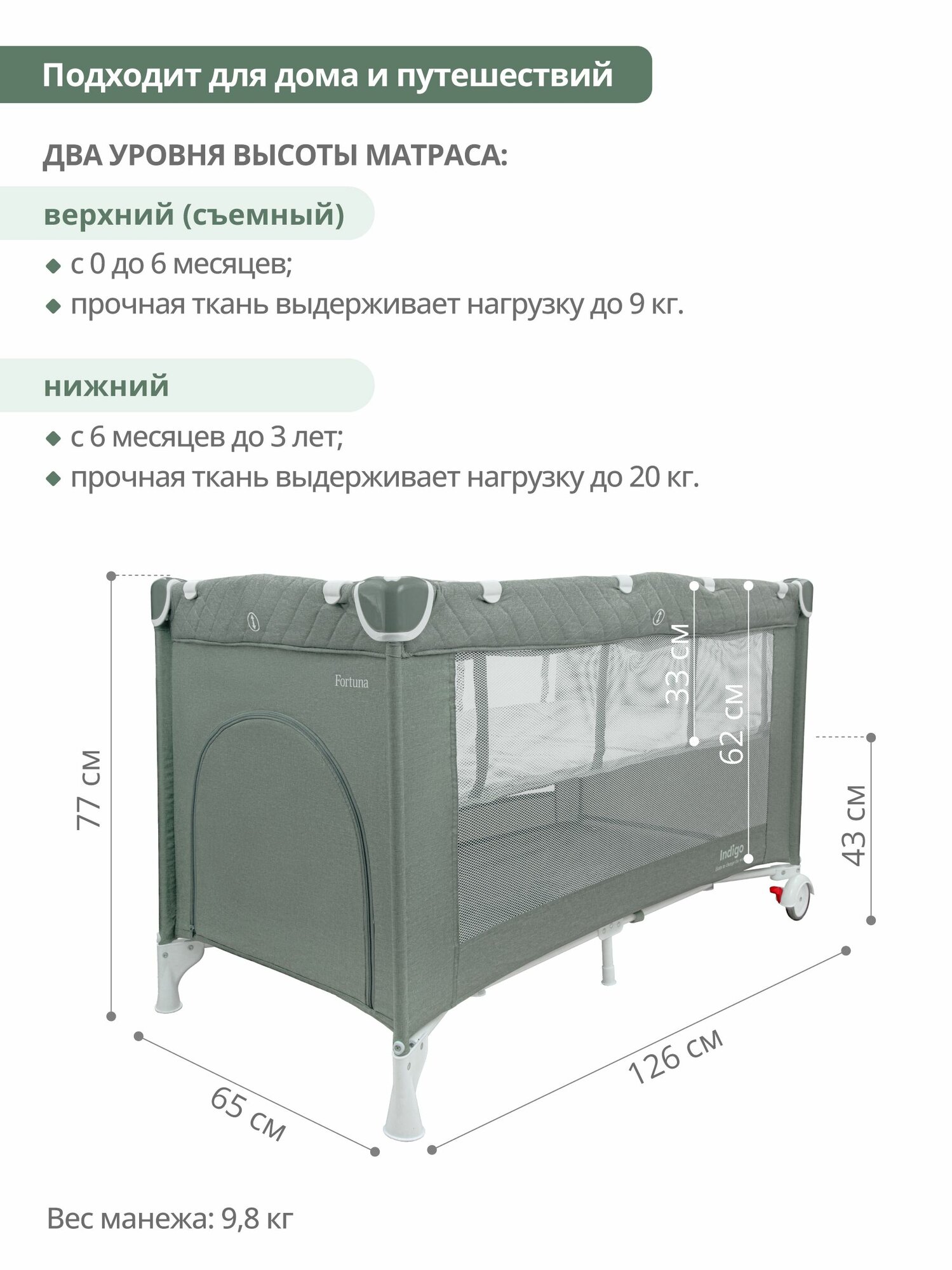 Манеж кровать детский Indigo Fortuna, для новорожденных, с матрасом и москитной сеткой, складной, 2 уровня, зеленый интересное: