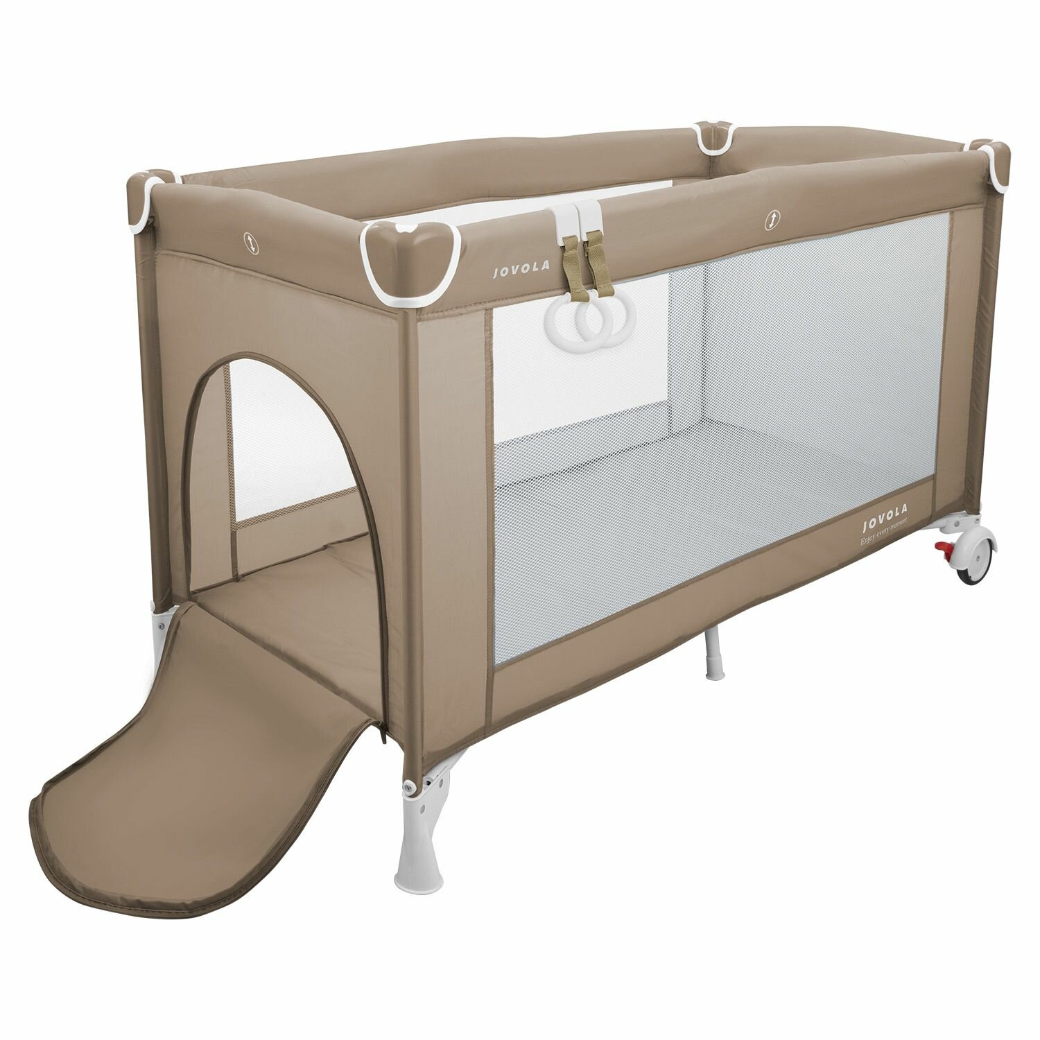 Манеж кровать детский JOVOLA AMICO, для новорожденных с матрасом и москитной сеткой, складной, 2 уровня, бежевый бамбук (мокко)