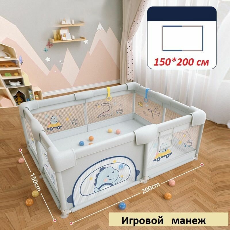 150*200 см. ДИНОЗАВРИК_Манеж детский игровой сборный с шариками и держателями, цвет серый. интересное: