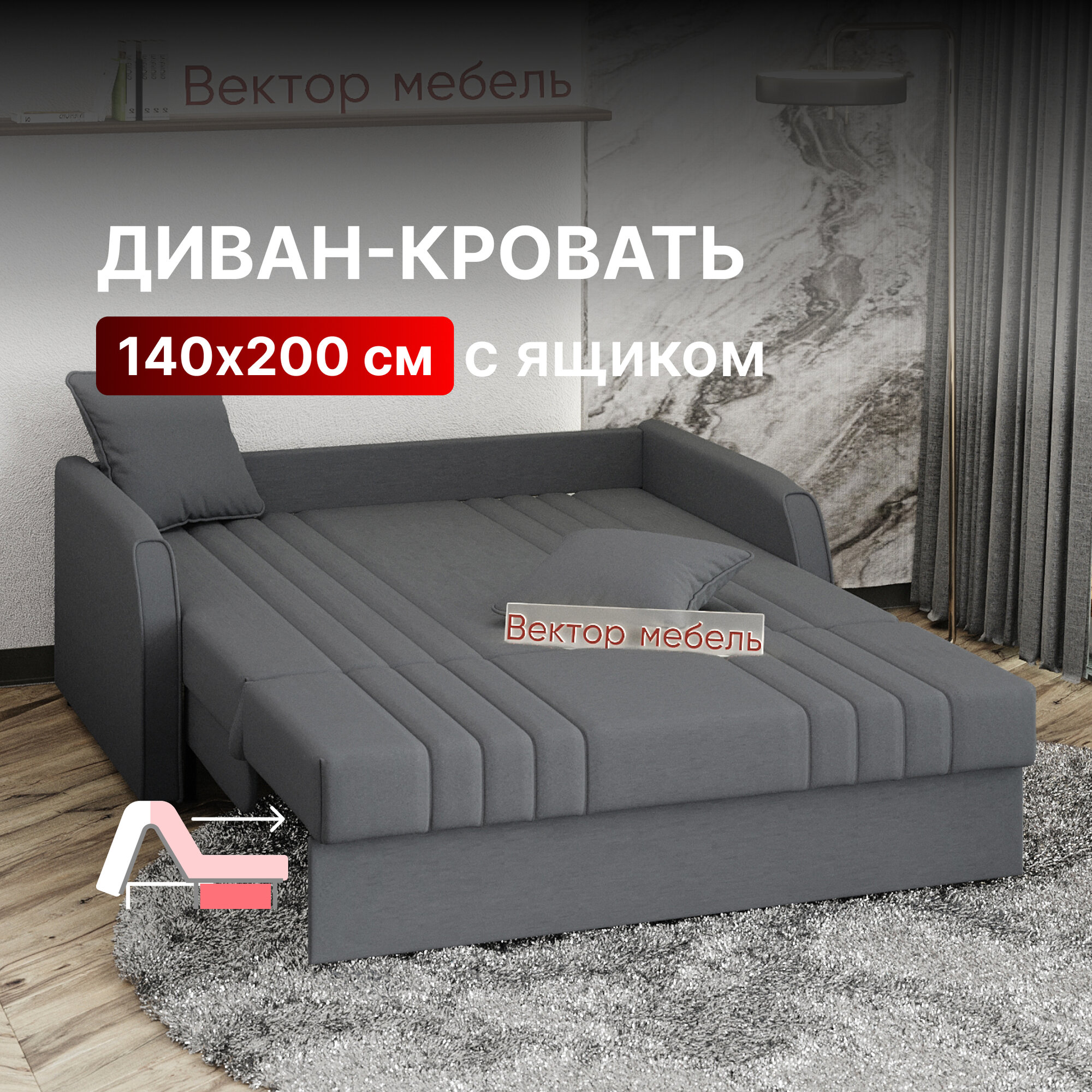 Диван-кровать с ящиком раскладной прямой на металлокаркасе, аккордеон, ортопедический, 140х200, велюр темно-серый интересное:
