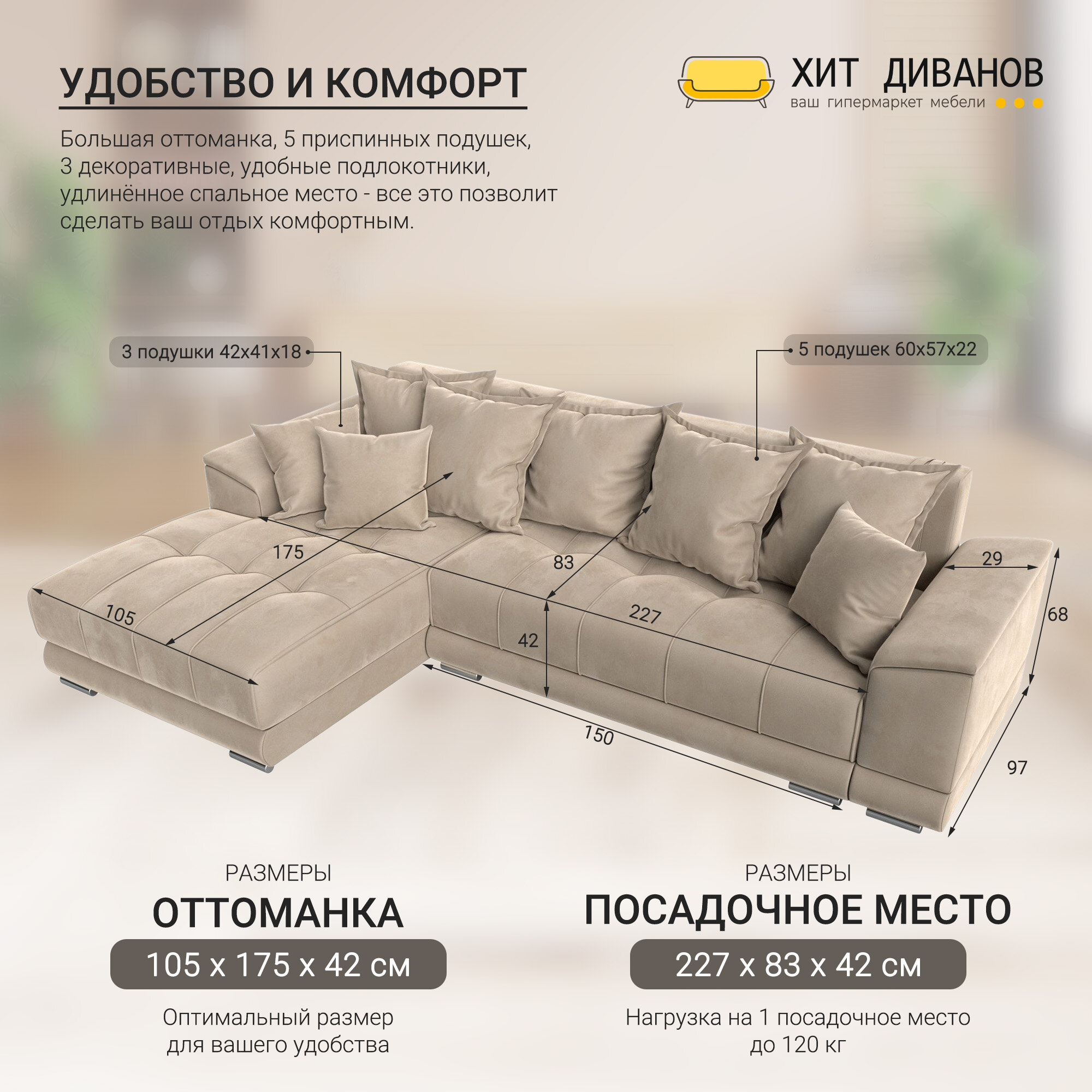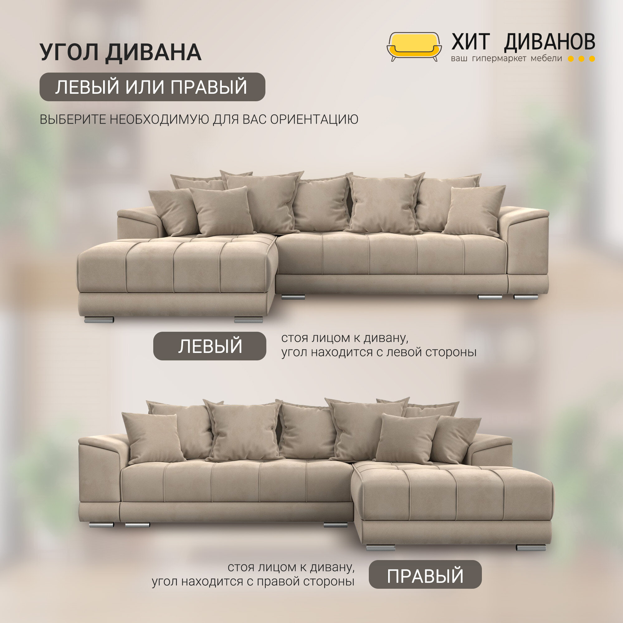 Диван угловой НордСтар левый угол, микровельвет, механизм еврокнижка, бежевый, 284x190x93см. Хит Диванов