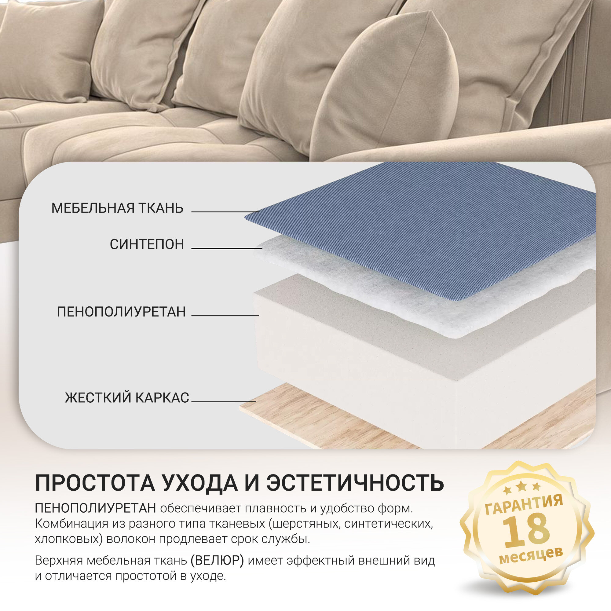 Диван угловой НордСтар правый угол, велюр, механизм еврокнижка, бежевый, 284x190x93см. Хит Диванов