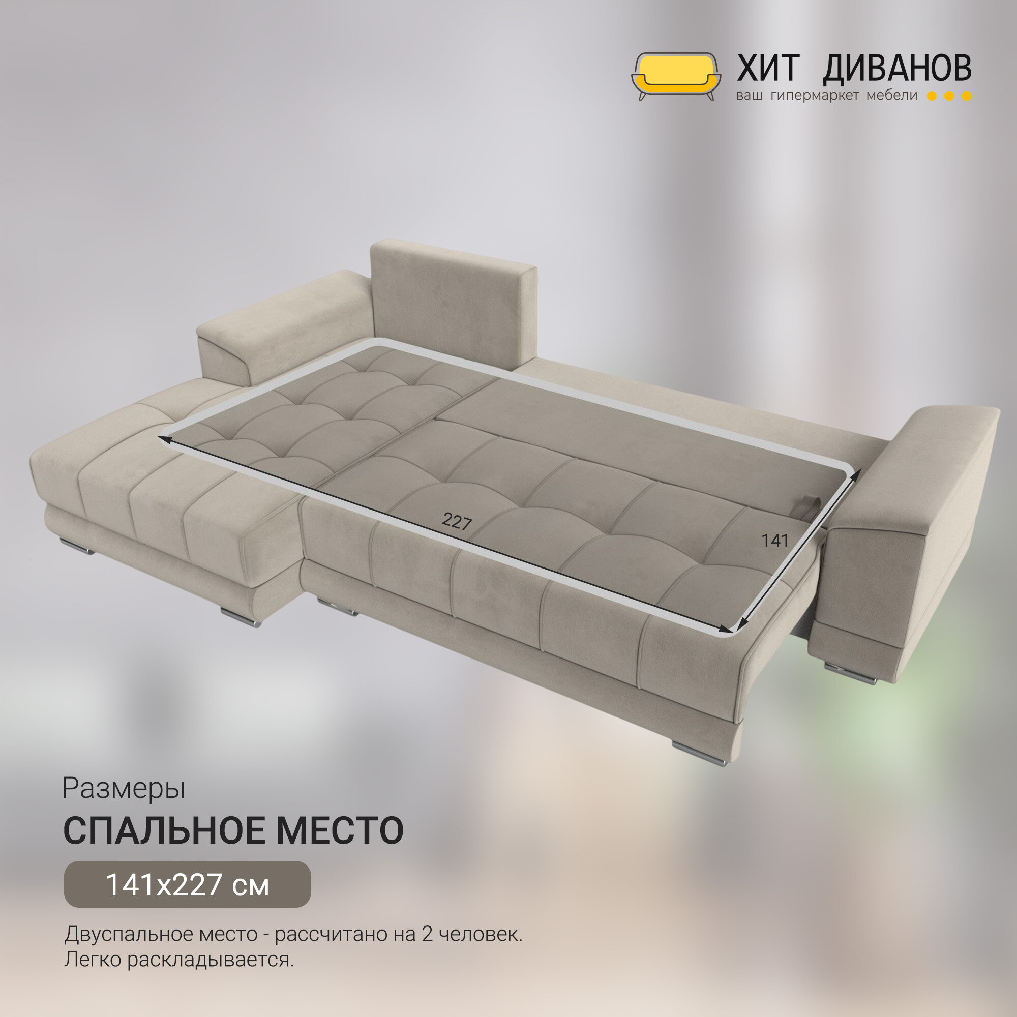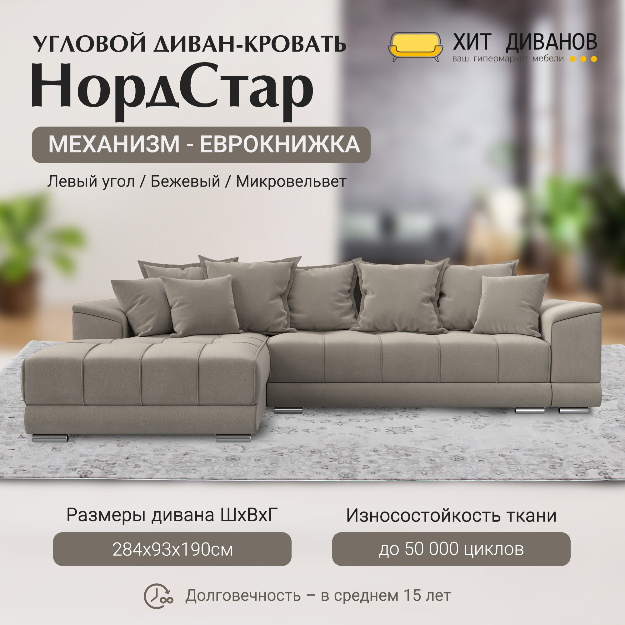 СохранитьДиван угловой НордСтар левый угол, микровельвет, механизм еврокнижка, бежевый, 284x190x93см. Хит Диванов интересное: