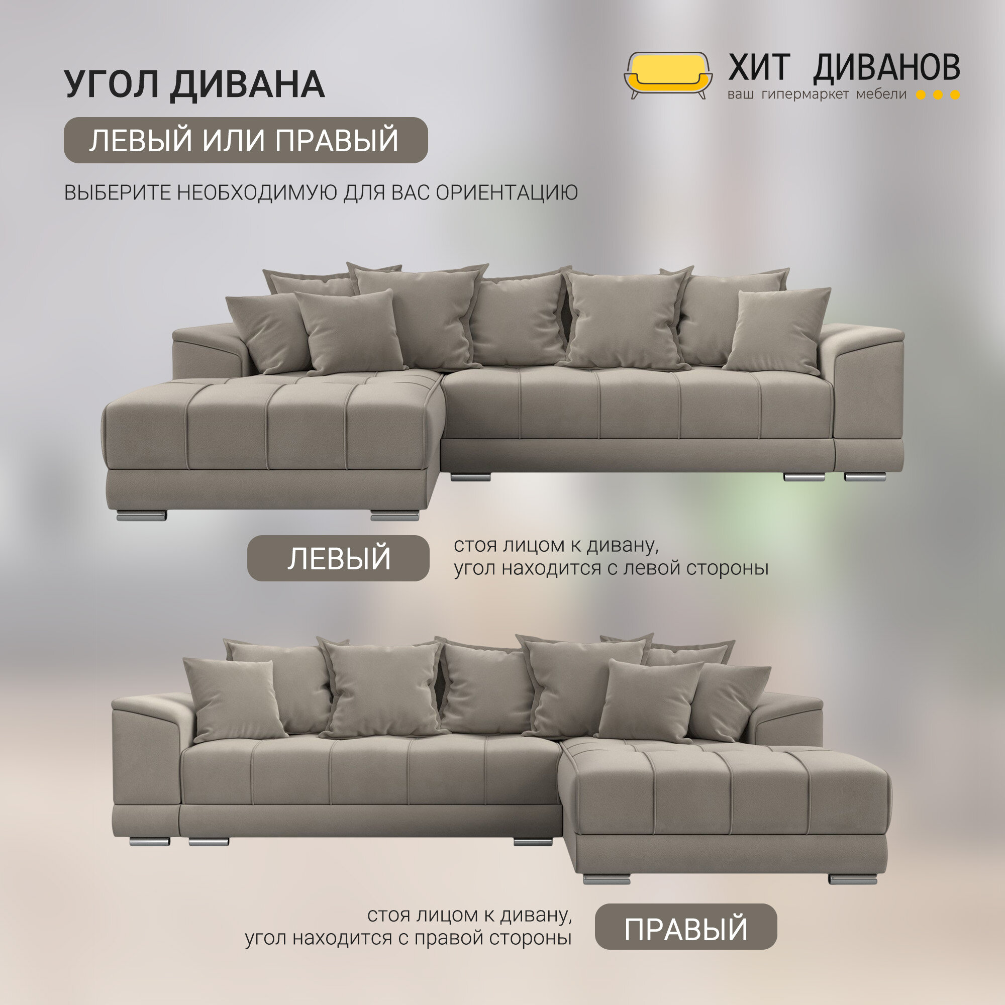 Диван угловой НордСтар правый угол, велюр, механизм еврокнижка, бежевый, 284x190x93см. Хит Диванов