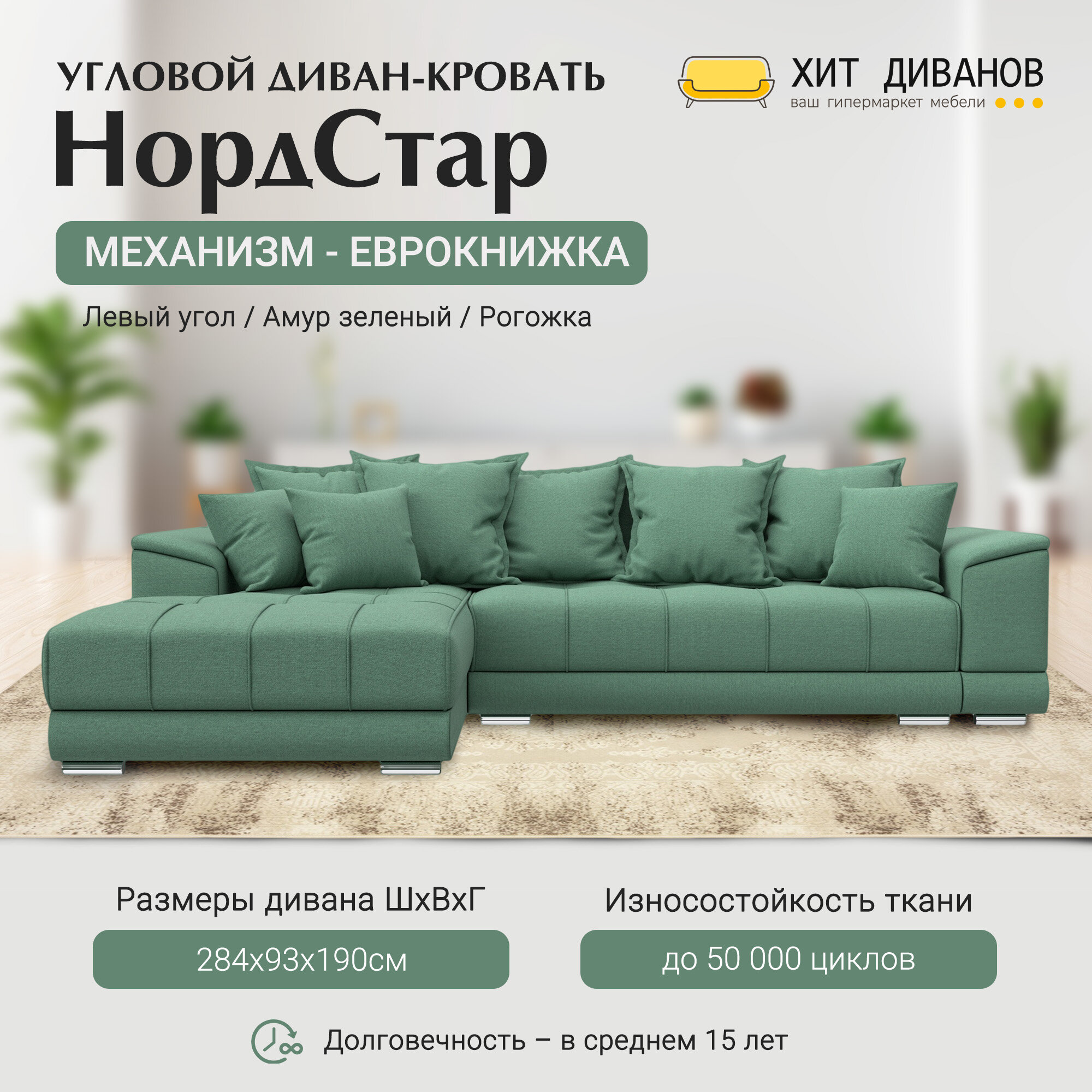 Ниже Вы можете прочитать отзывы на Диван угловой НордСтар левый угол, рогожка, механизм еврокнижка, Амур зеленый, 284x190x93см. Хит Диванов, ознакомится с подробными характеристиками, посмотреть интересные обзоры и фотографии на Диван угловой НордСтар левый угол, рогожка, механизм еврокнижка, Амур зеленый, 284x190x93см. Хит Диванов.