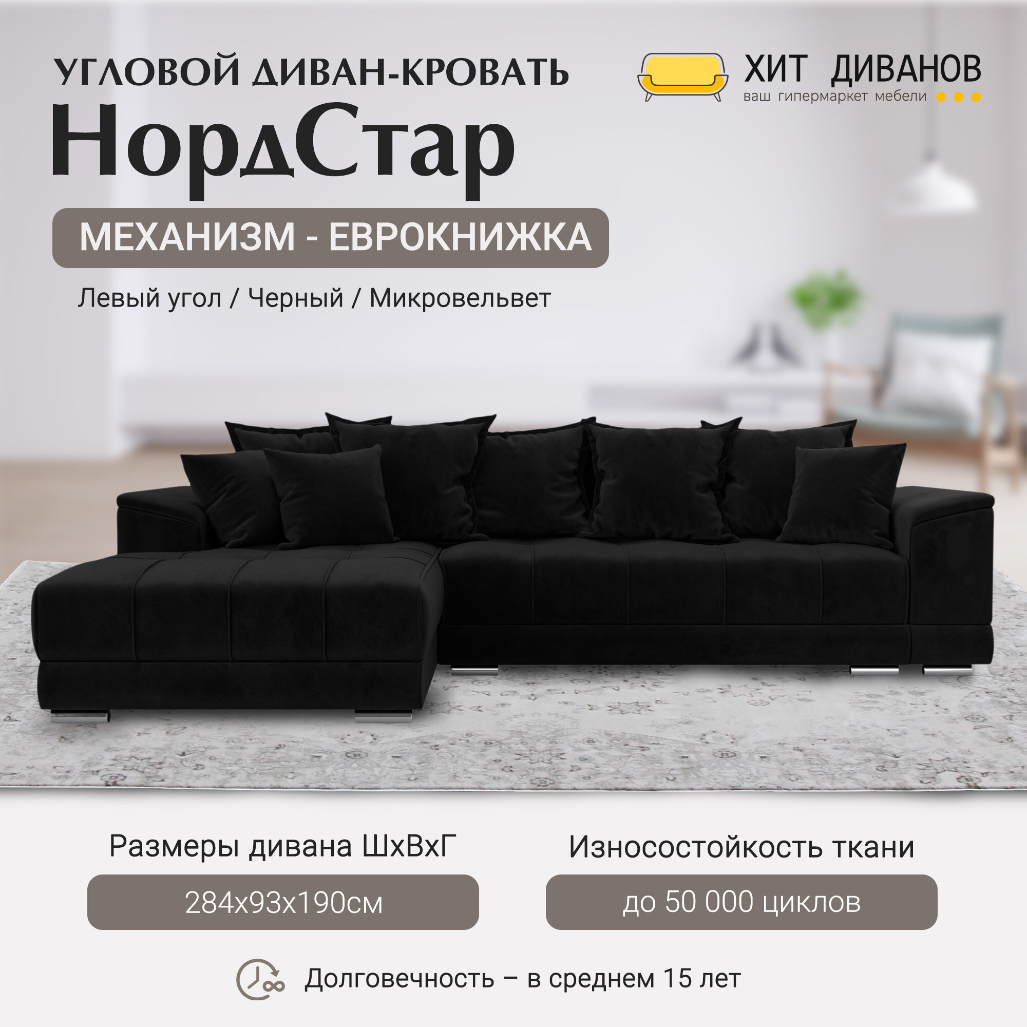 Купить Диван угловой НордСтар левый угол, микровельвет, механизм еврокнижка, черный, 284x190x93см. Хит Диванов
