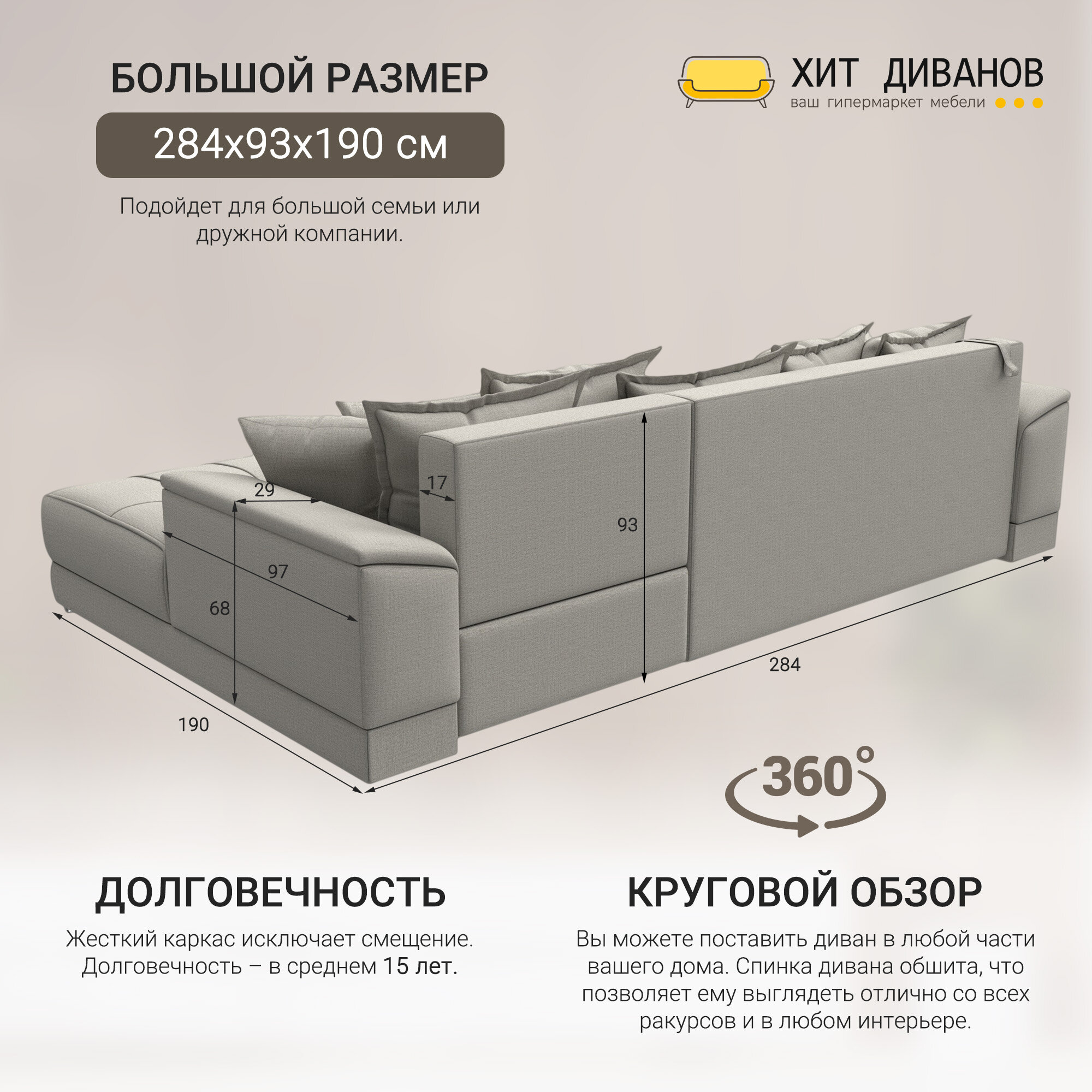 Диван угловой НордСтар правый угол, рогожка, механизм еврокнижка, Амур серый, 284x190x93см. Хит Диванов