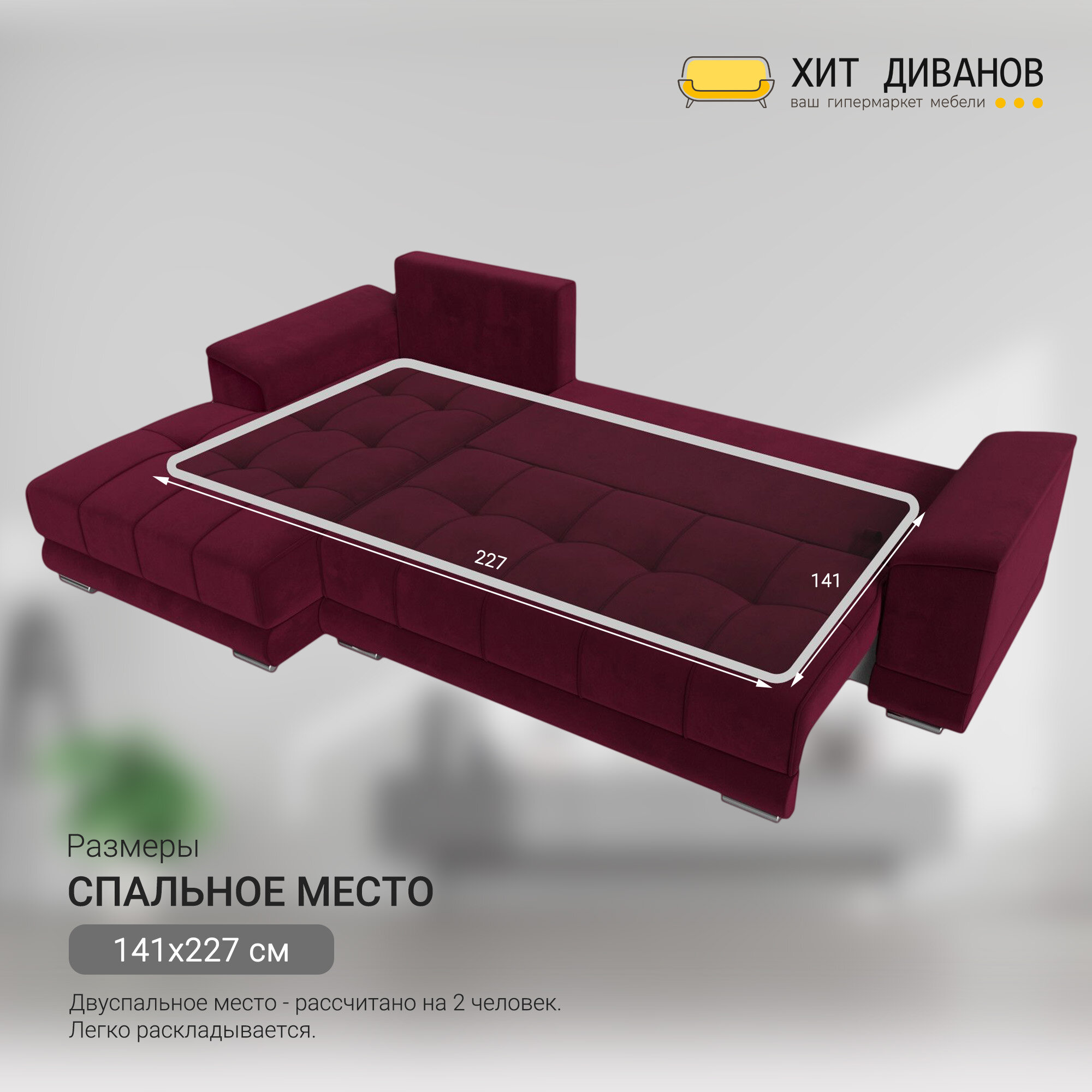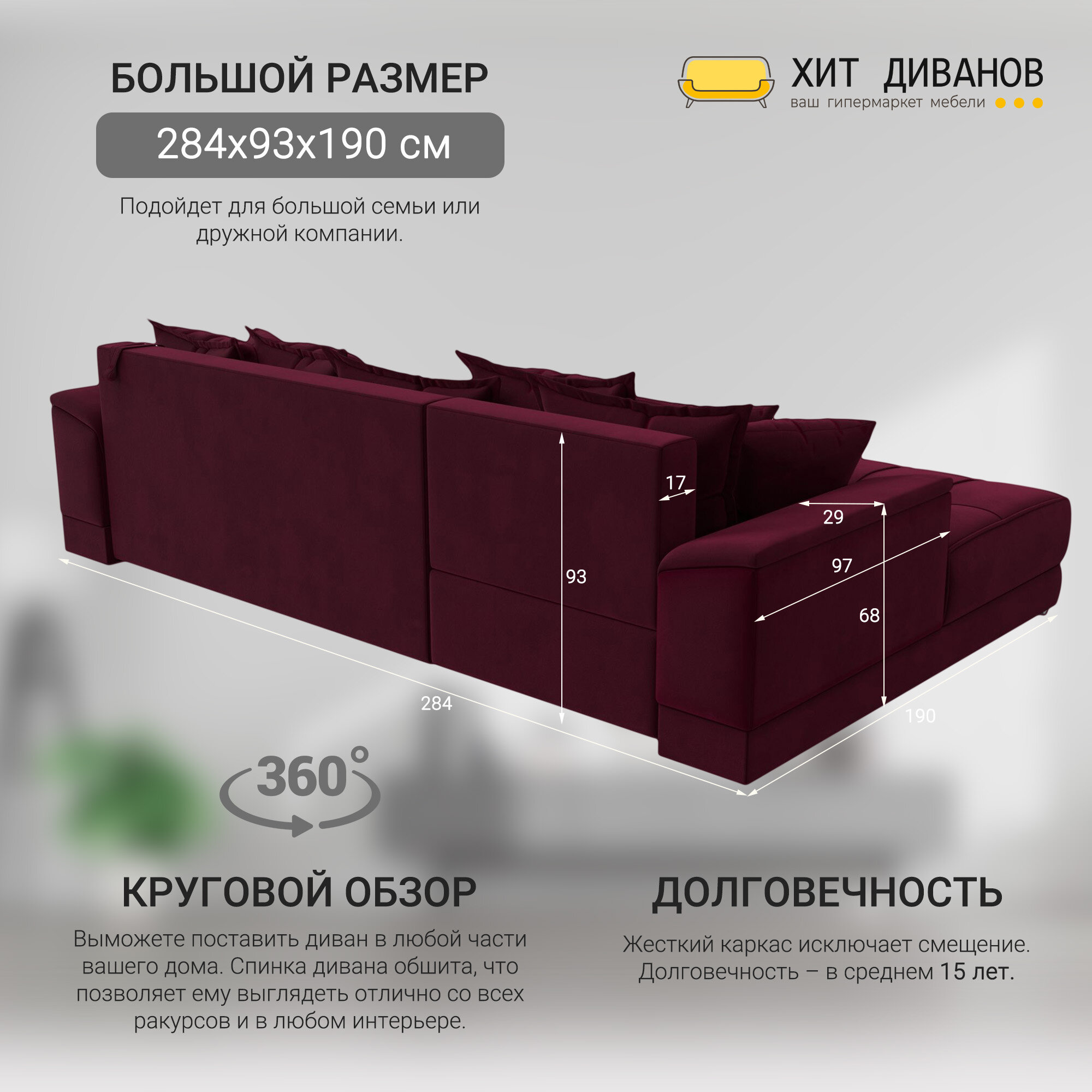 Диван угловой НордСтар правый угол, микровельвет, механизм еврокнижка, Бордовый, 284x190x93см. Хит Диванов