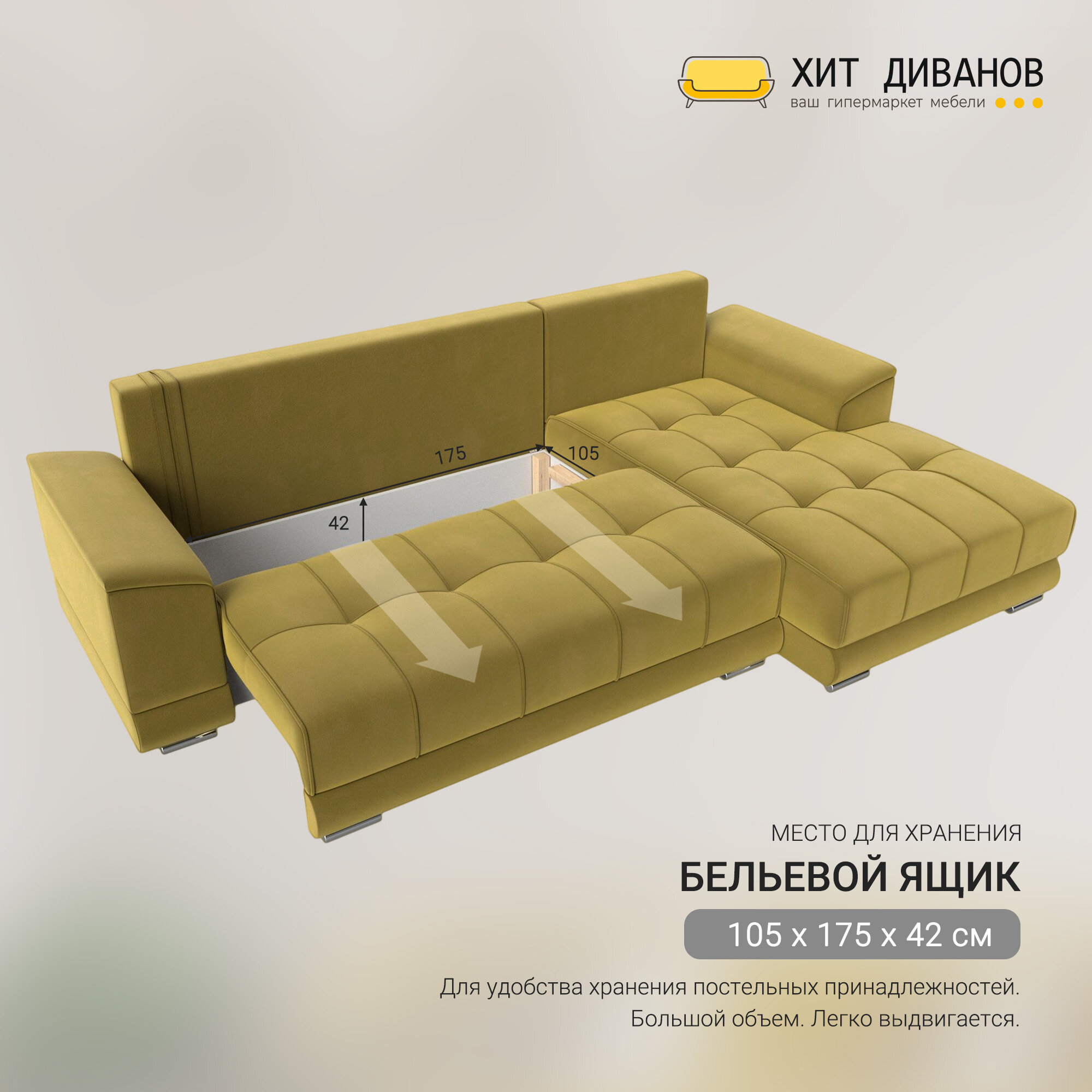 СохранитьДиван угловой НордСтар правый угол, микровельвет, механизм еврокнижка, желтый, 284x190x93см. Хит Диванов интересное: