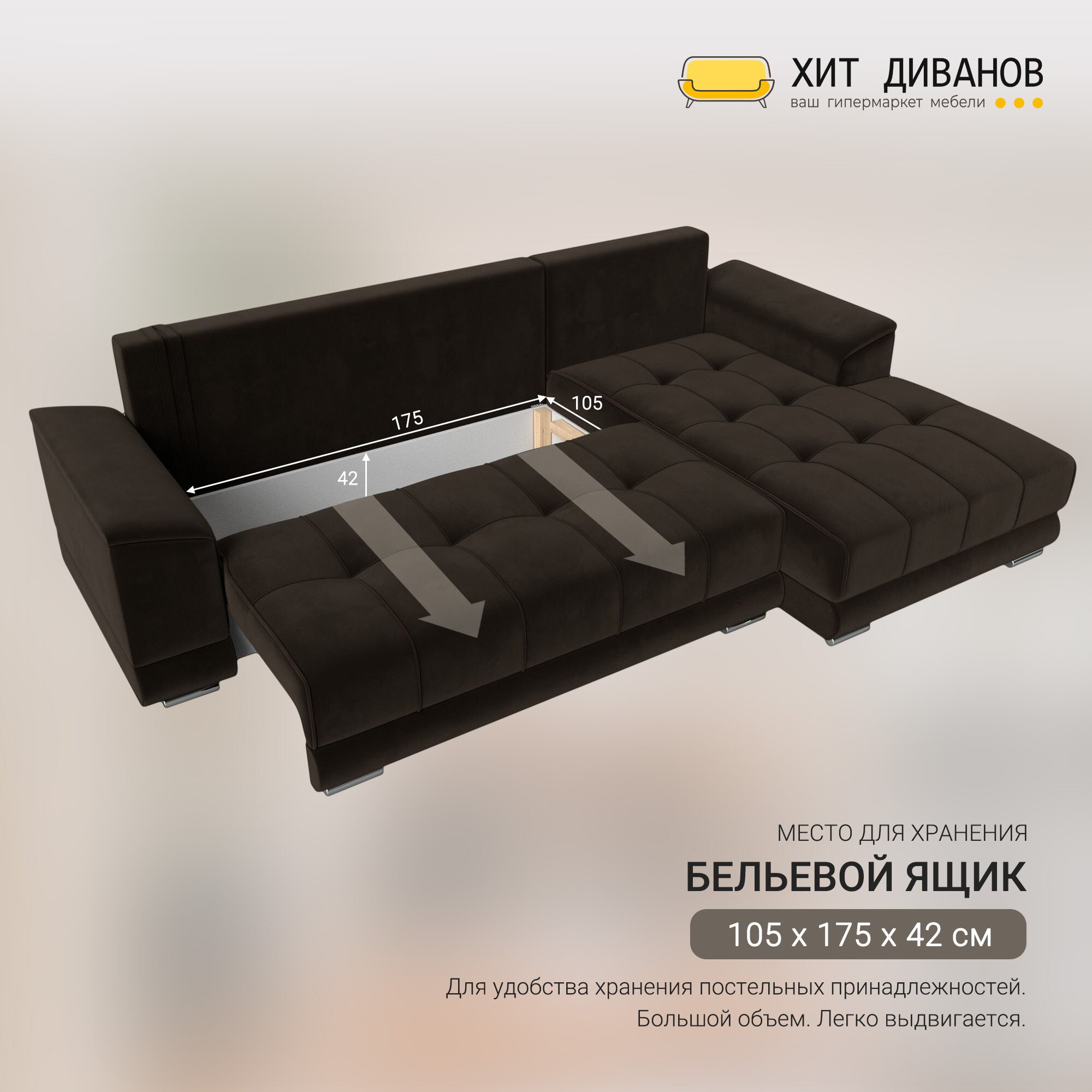 Диван угловой НордСтар правый угол, велюр, механизм еврокнижка, коричневый, 284x190x93см. Хит Диванов