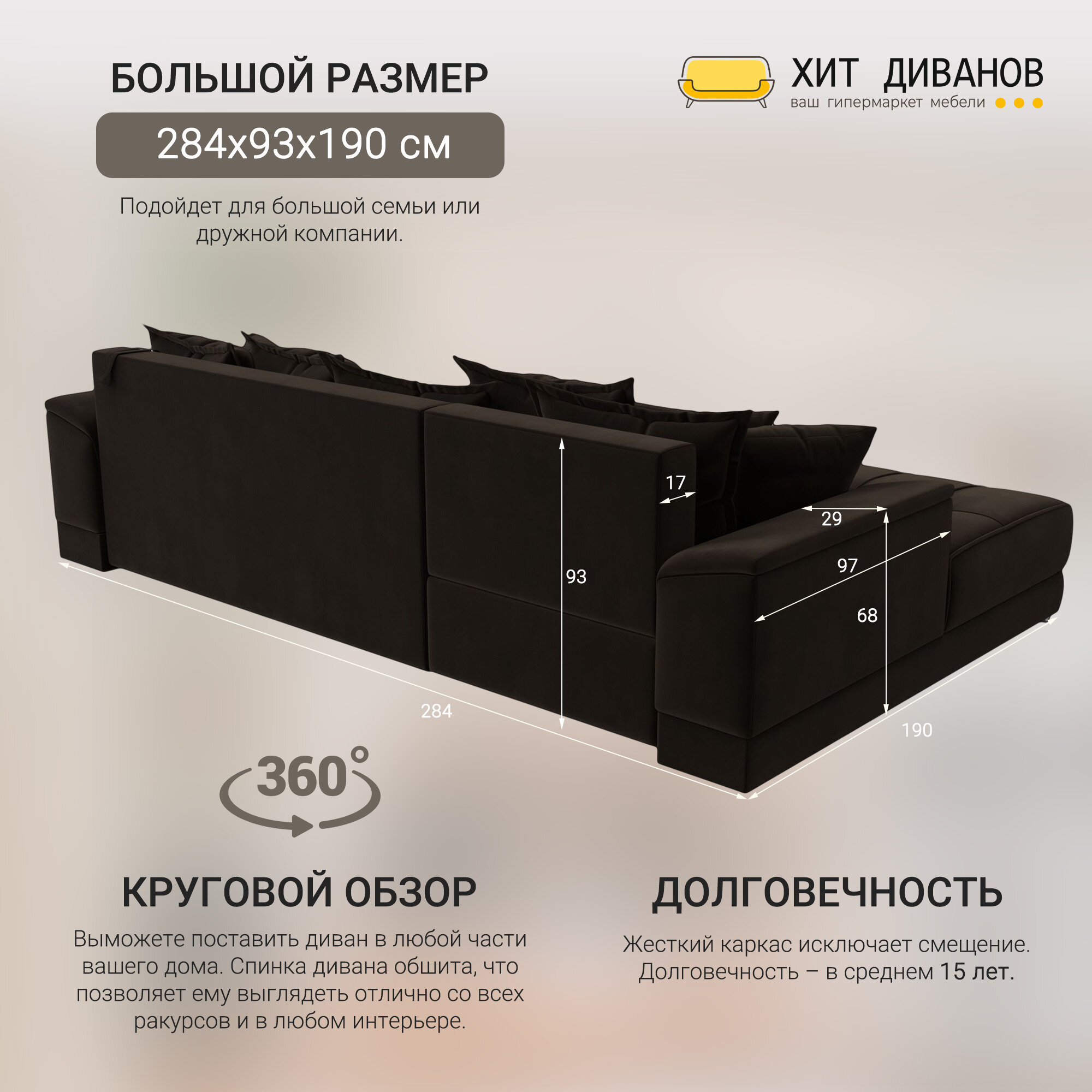 Диван угловой НордСтар правый угол, велюр, механизм еврокнижка, черный, 284x190x93см. Хит Диванов