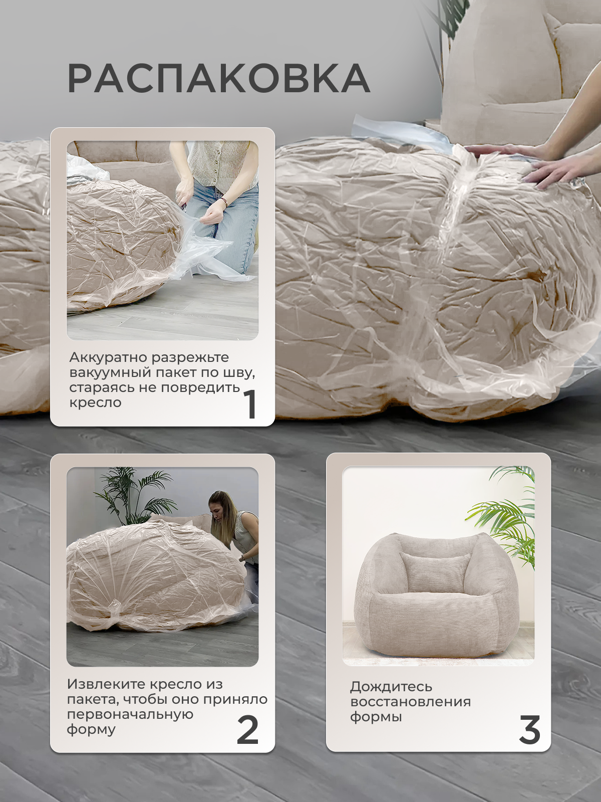Кресло-пуф бескаркасное Ramelka CAPRI, микровелюровый чехол, съёмный, бежевый интересное: