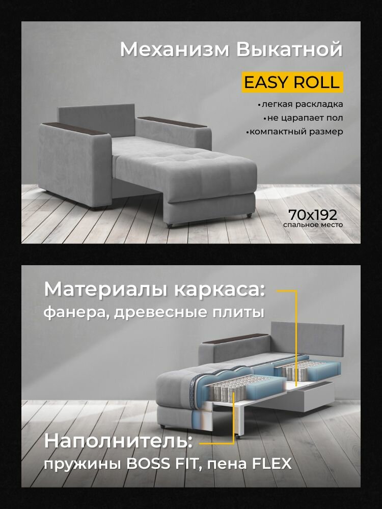 Кресло-кровать раскладное BOSS 2.0, механизм easy roll, велюр Monolit серый, 106х114х90 см