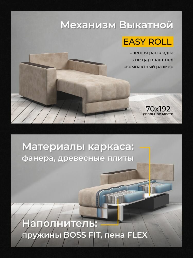 Кресло-кровать раскладное BOSS 2.0, механизм easy roll, велюр Monolit латте, 106х114х90 см