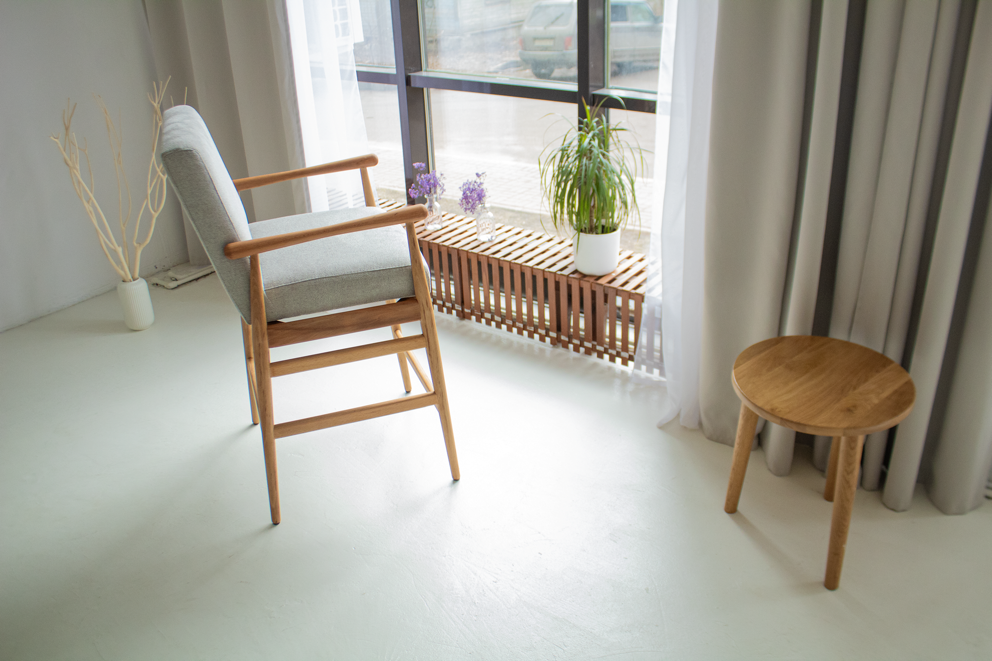 Кресло Хэйро лёгкое, точёный массив кавказского бука покрыт масло-воском, ткань: светло-серый шенилл