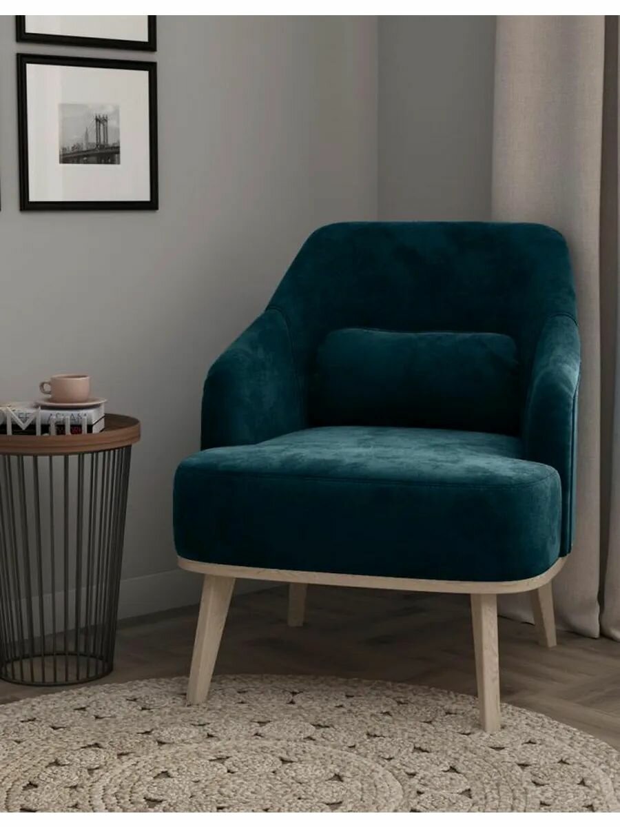 Кресло мягкое Лаурель Миди для отдыха дома с декоративной подушкой, высокие ножки, 67х79х79 см, Лазурь, микровелюр