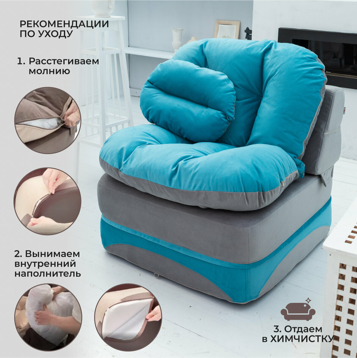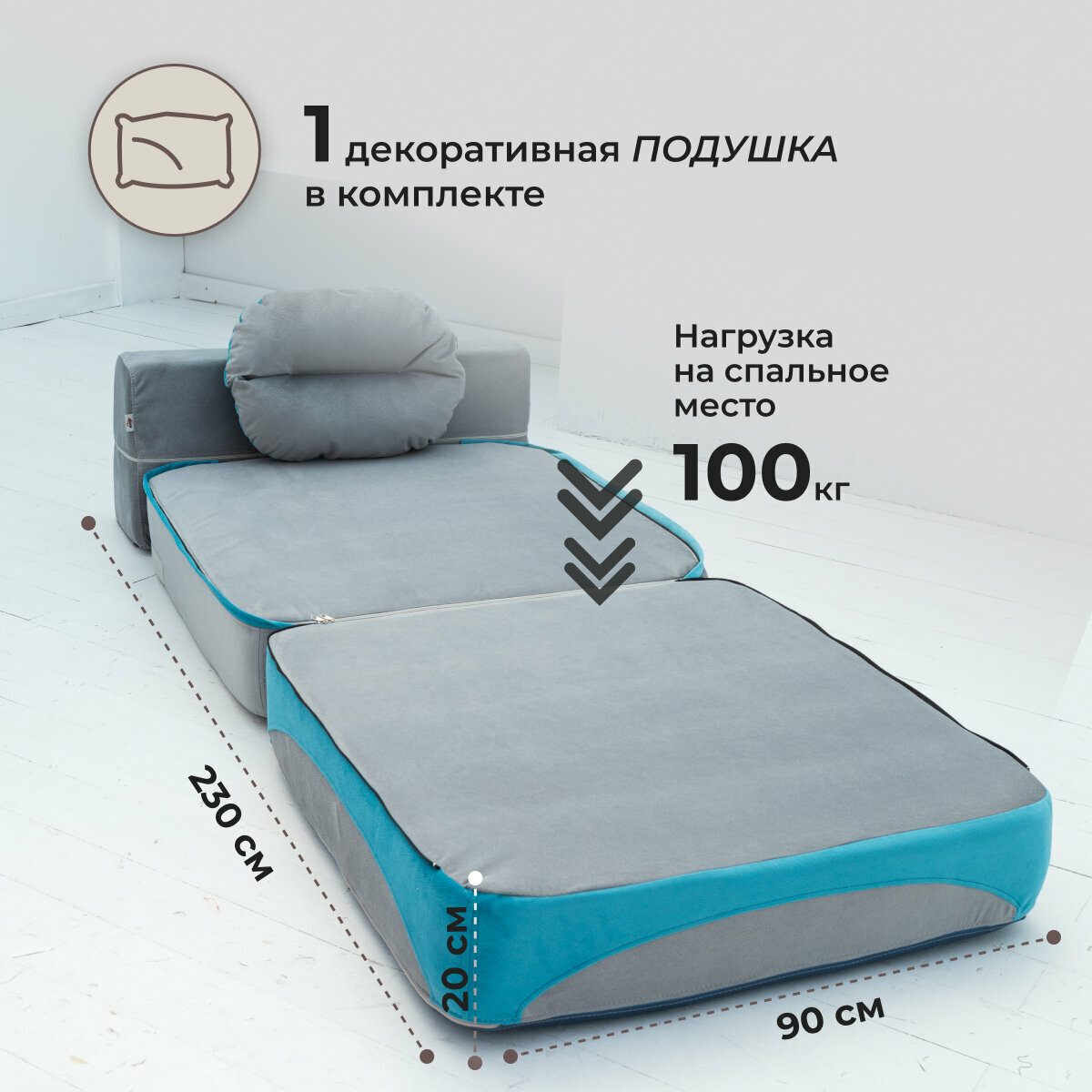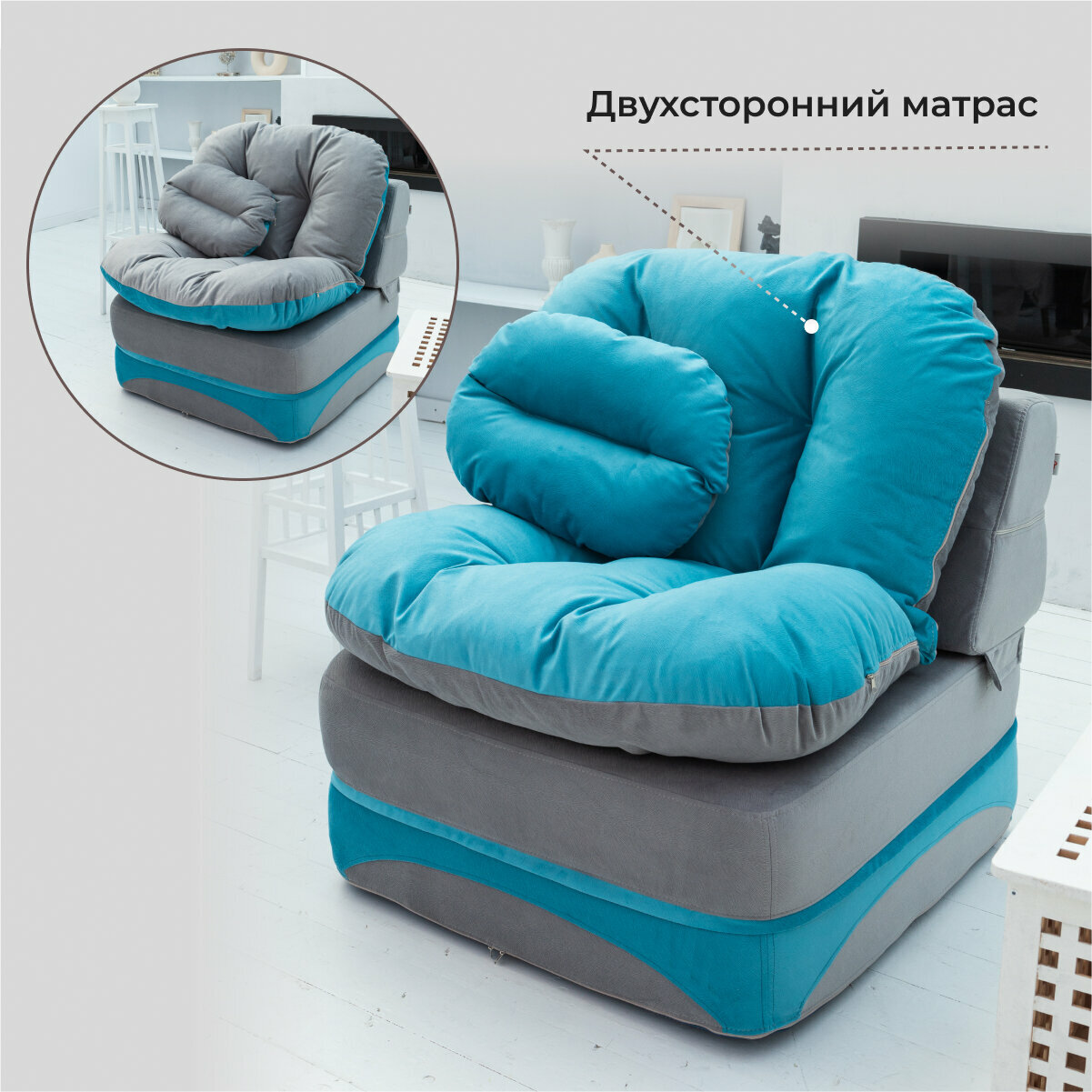СохранитьКресло кровать раскладное, бескаркасное 90*95 см с матрасом Клиффорд, спальное место 90*230 см, бирюзовое с серым интересное: