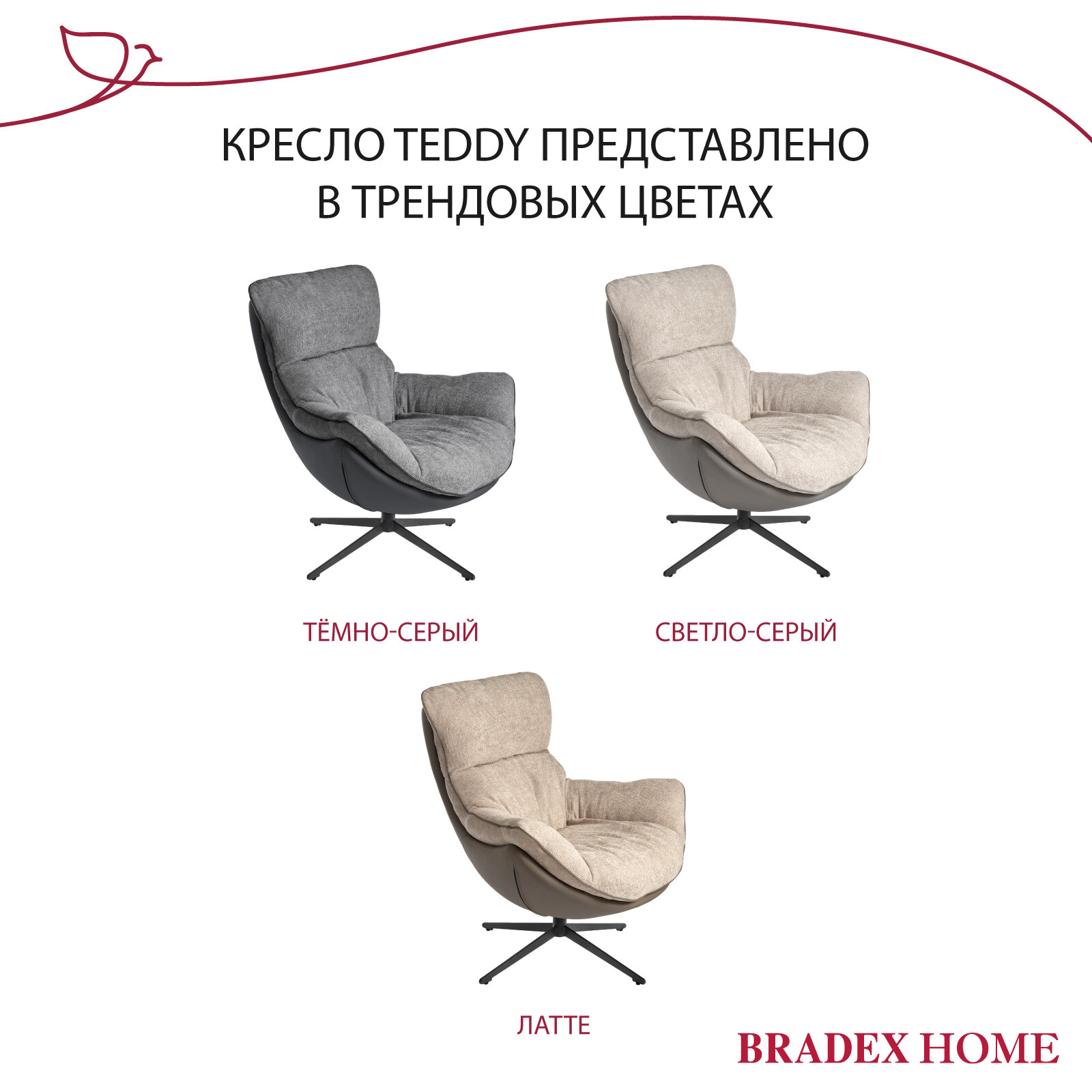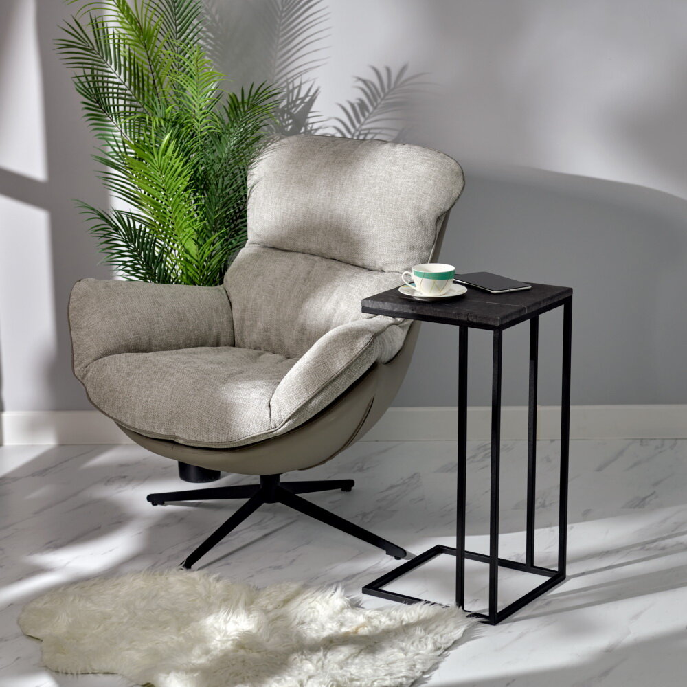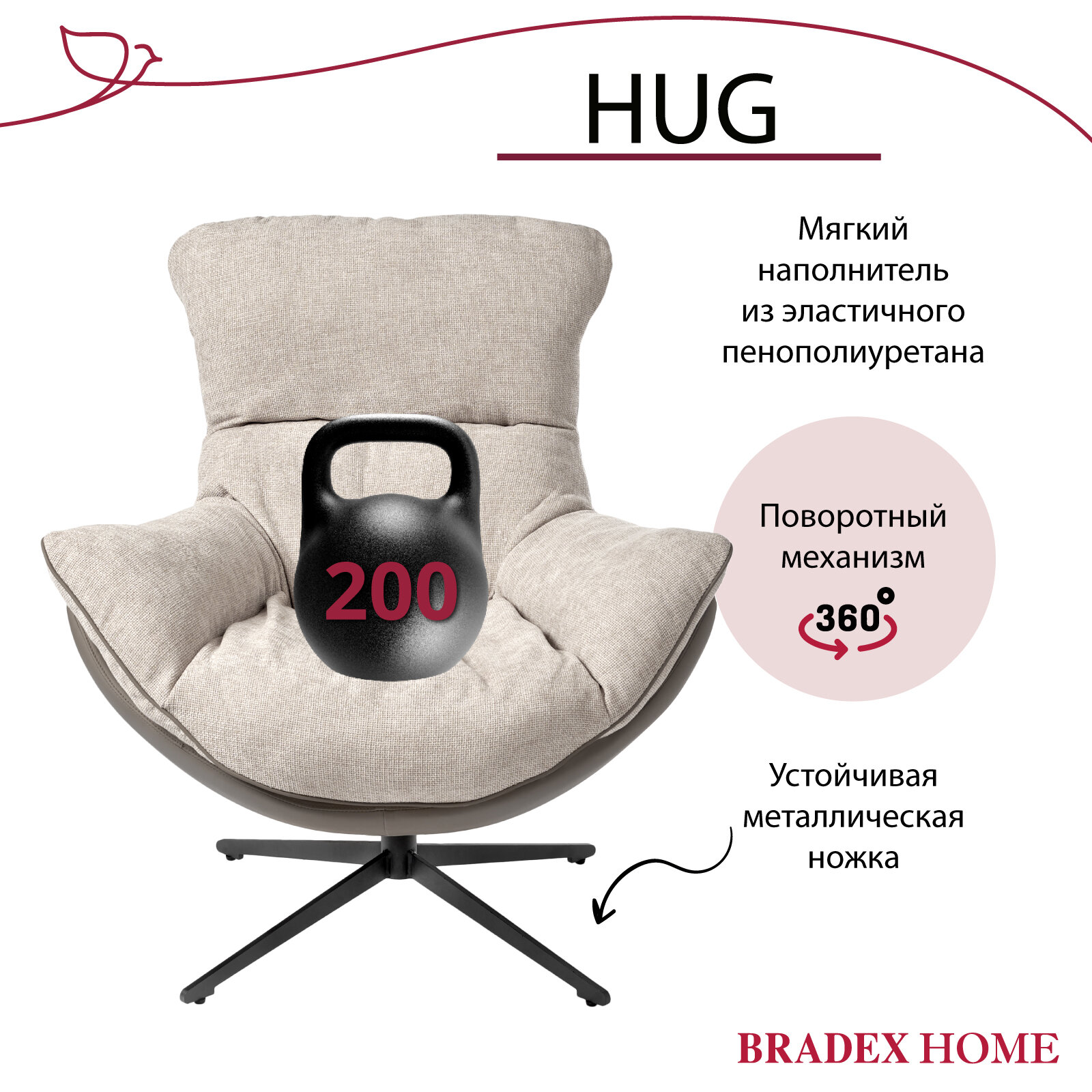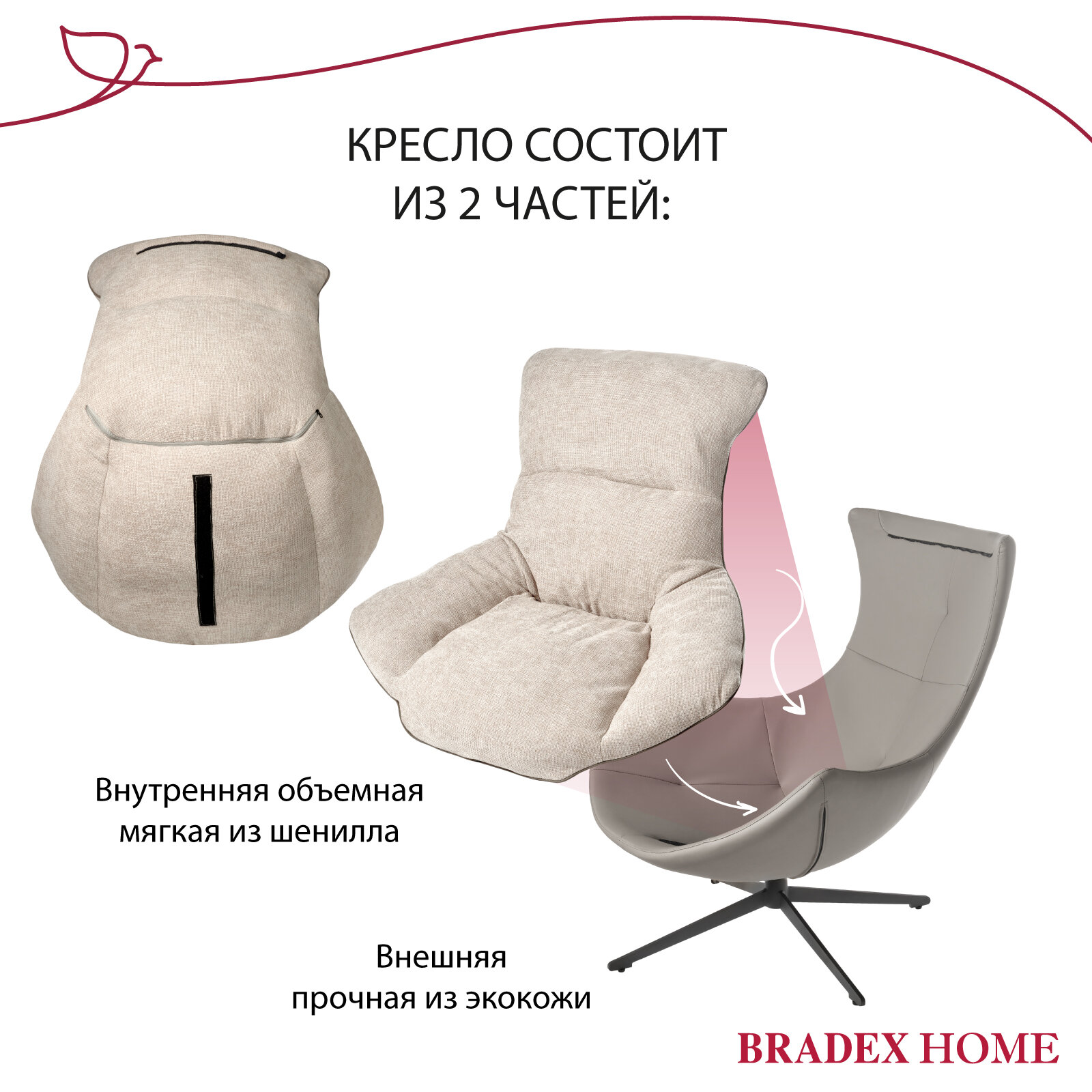 Кресло мягкое для дома HUG светло-серое, экокожа, шенилл, для отдыха в гостиную, крутящееся 360 на ножке интересное: