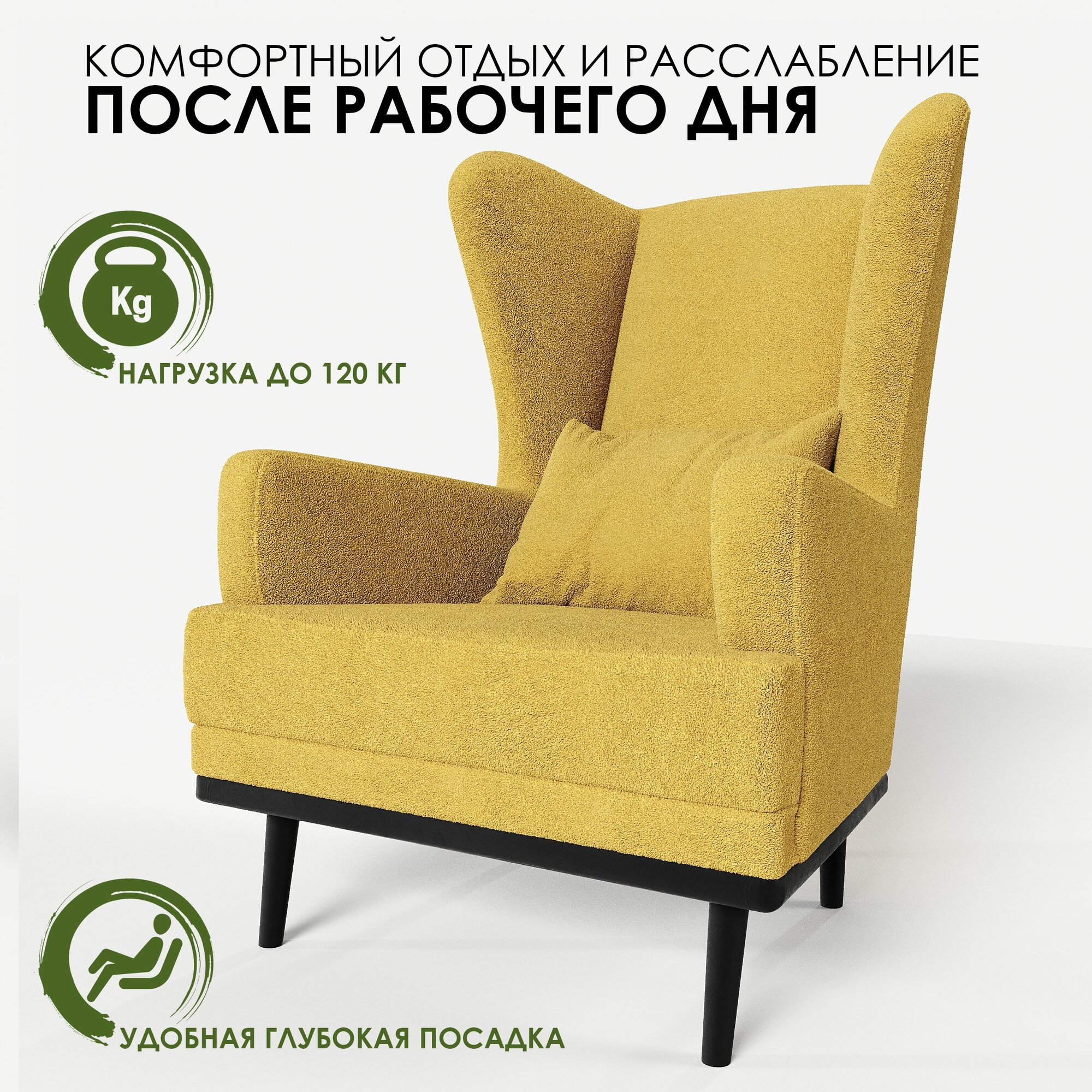 СохранитьМягкое кресло с ушами Фантазёр искусственный мех желтый L-6 на высоких ножках, для отдыха и чтения книг. В гостиную, балкон, спальню и переговорную комнату. интересное: