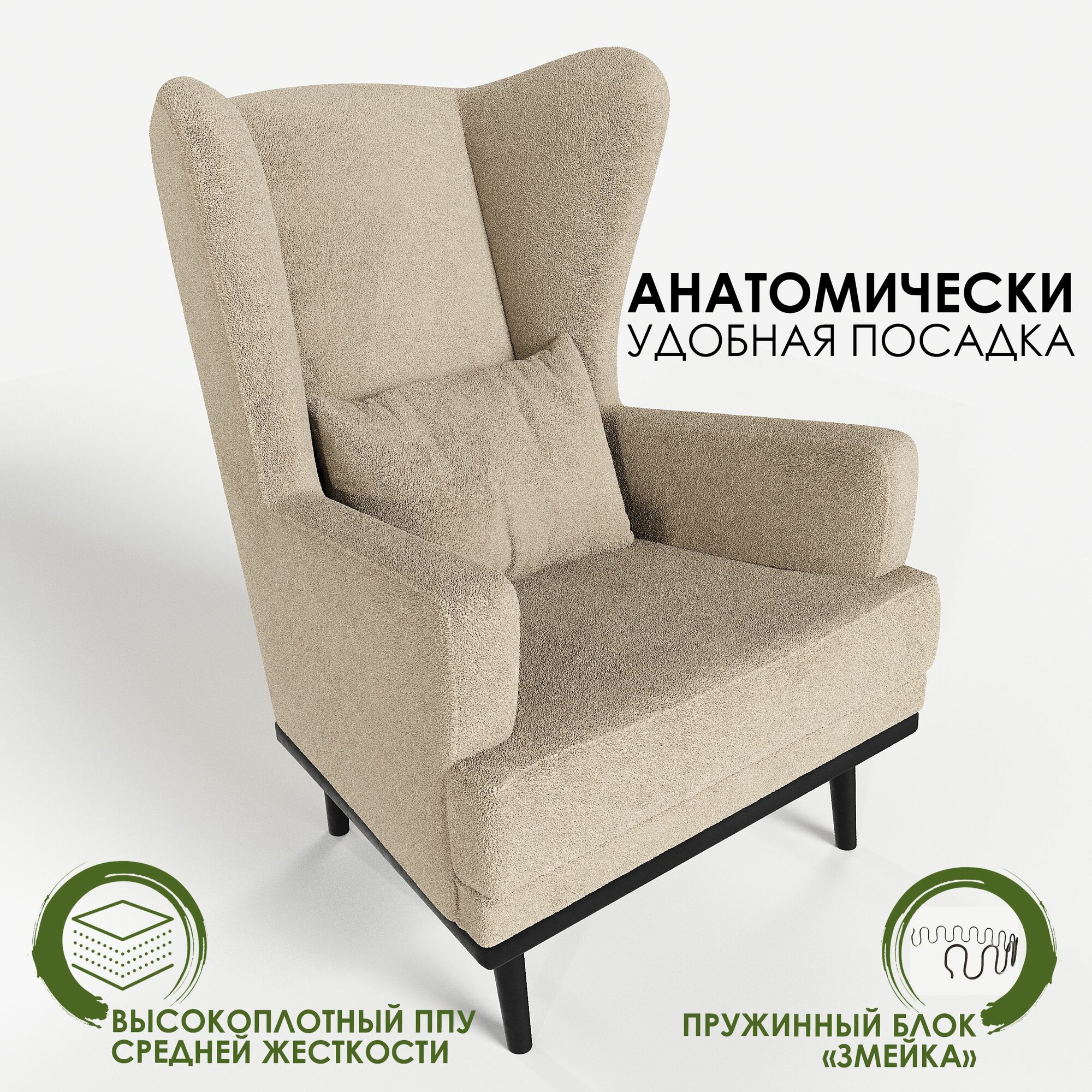 Кресло мягкое с ушами Фантазёр эко-кожа бежевый на высоких ножках, для ожидания, отдыха и чтения книг. Для дома и общественных мест. В гостиную, балкон, спальню и переговорную комнату.