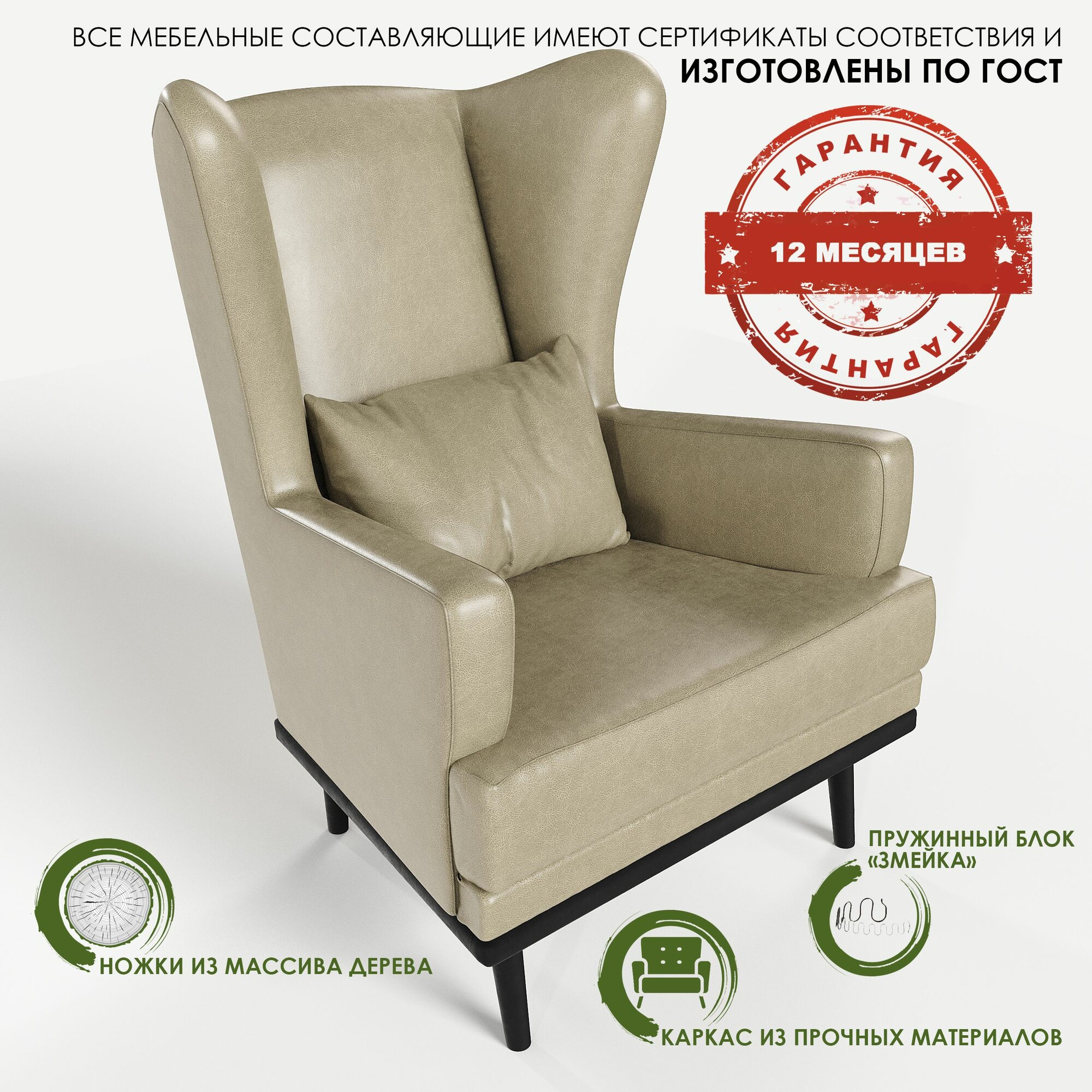 Купить Кресло мягкое с ушами Фантазёр эко-кожа бежевый на высоких ножках, для ожидания, отдыха и чтения книг. Для дома и общественных мест. В гостиную, балкон, спальню и переговорную комнату.