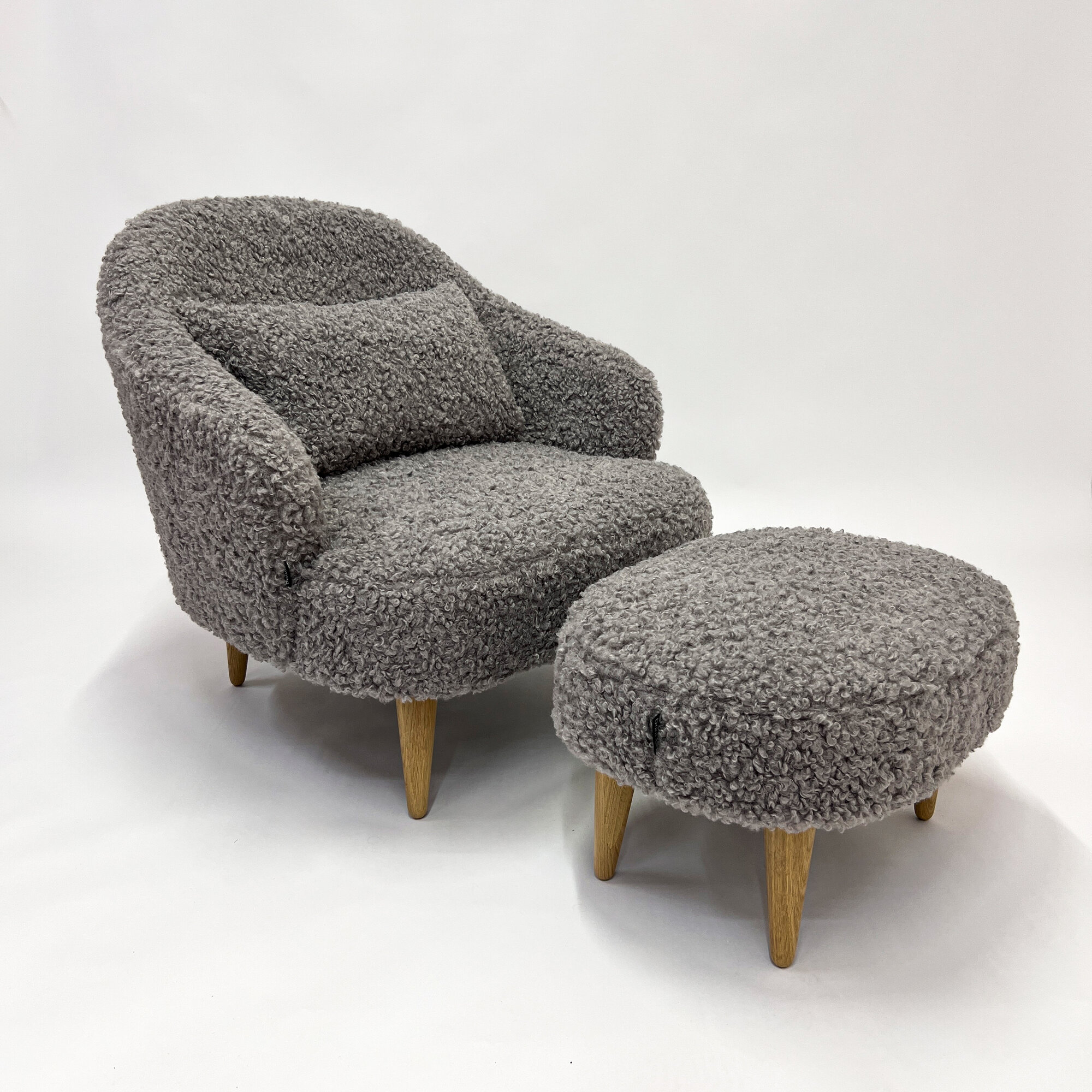 Комплект классическое кресло "Унно" + пуф, Кремовый мех, кресло барашек