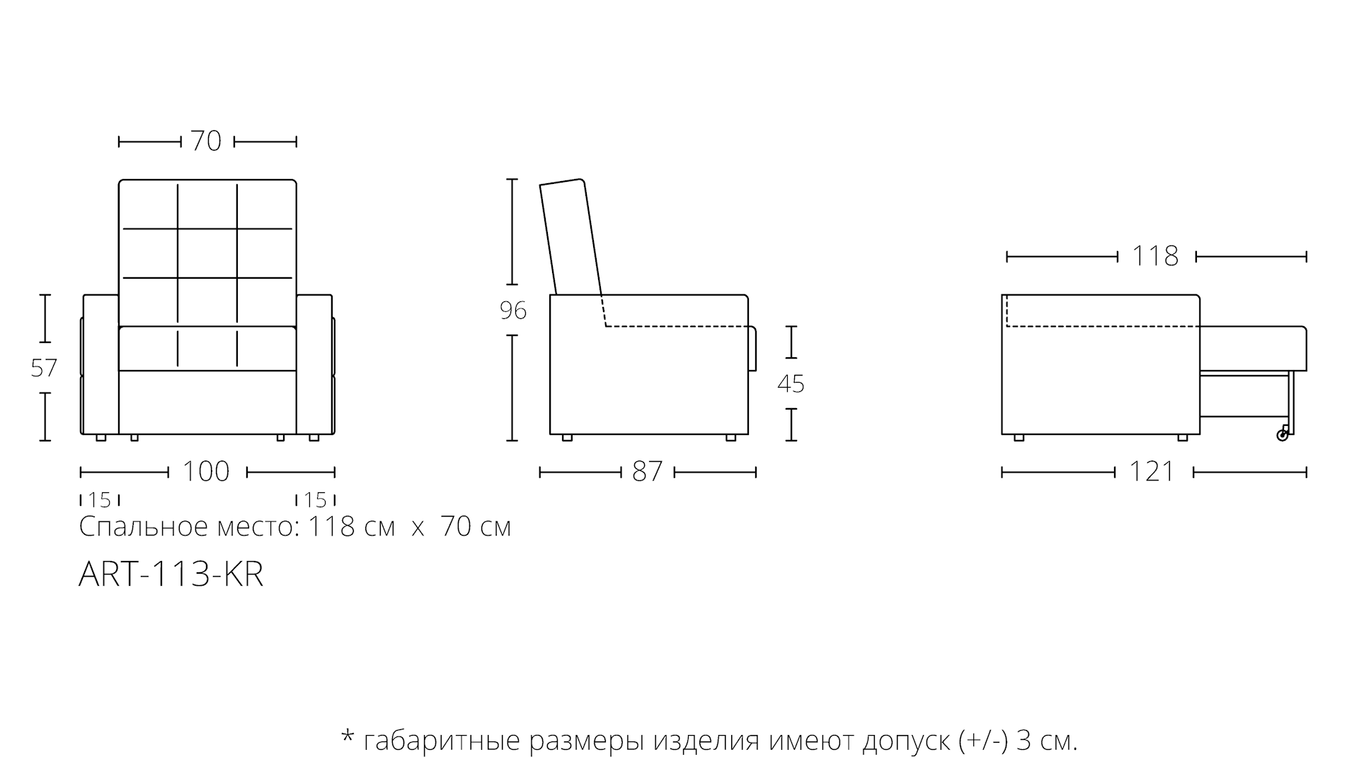 Кресло раскладное WESTENY "ART-113" 100х87х96, 118х70, темно-серый велюр