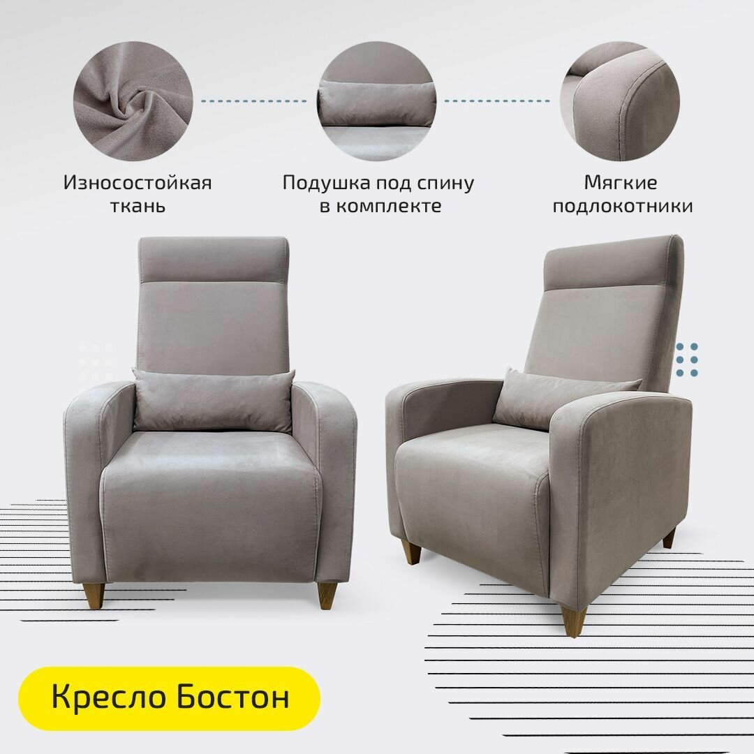 Кресло Бостон 76х110х76 см, мягкое для отдыха диванное, на ножках, бежево-серый велюр интересное: