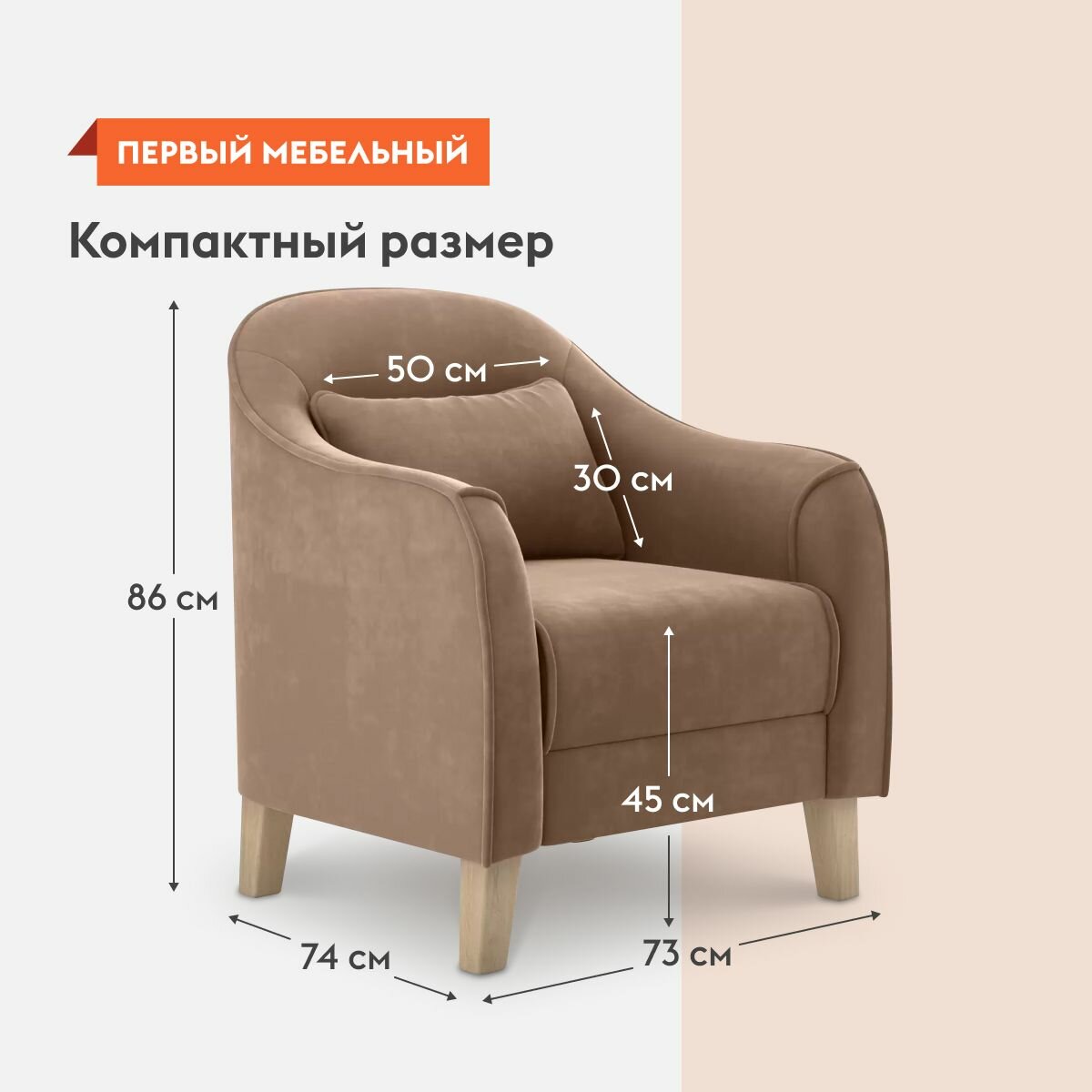 СохранитьКресло мягкое Эдита для отдыха дома с декоративной подушкой, высокие ножки, 73х74х86 см, Латте, велюр интересное: