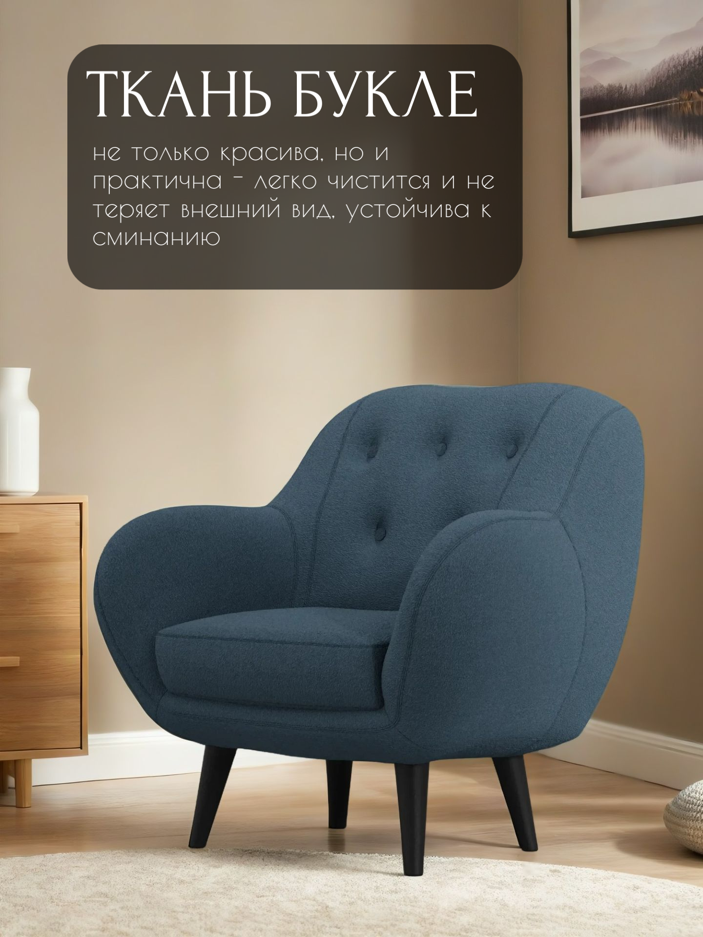 Кресло Сопрано мягкое, кресло букле, барашек, для отдыха и чтения, цвет: Темно-голубой, Синий, Джинсовый