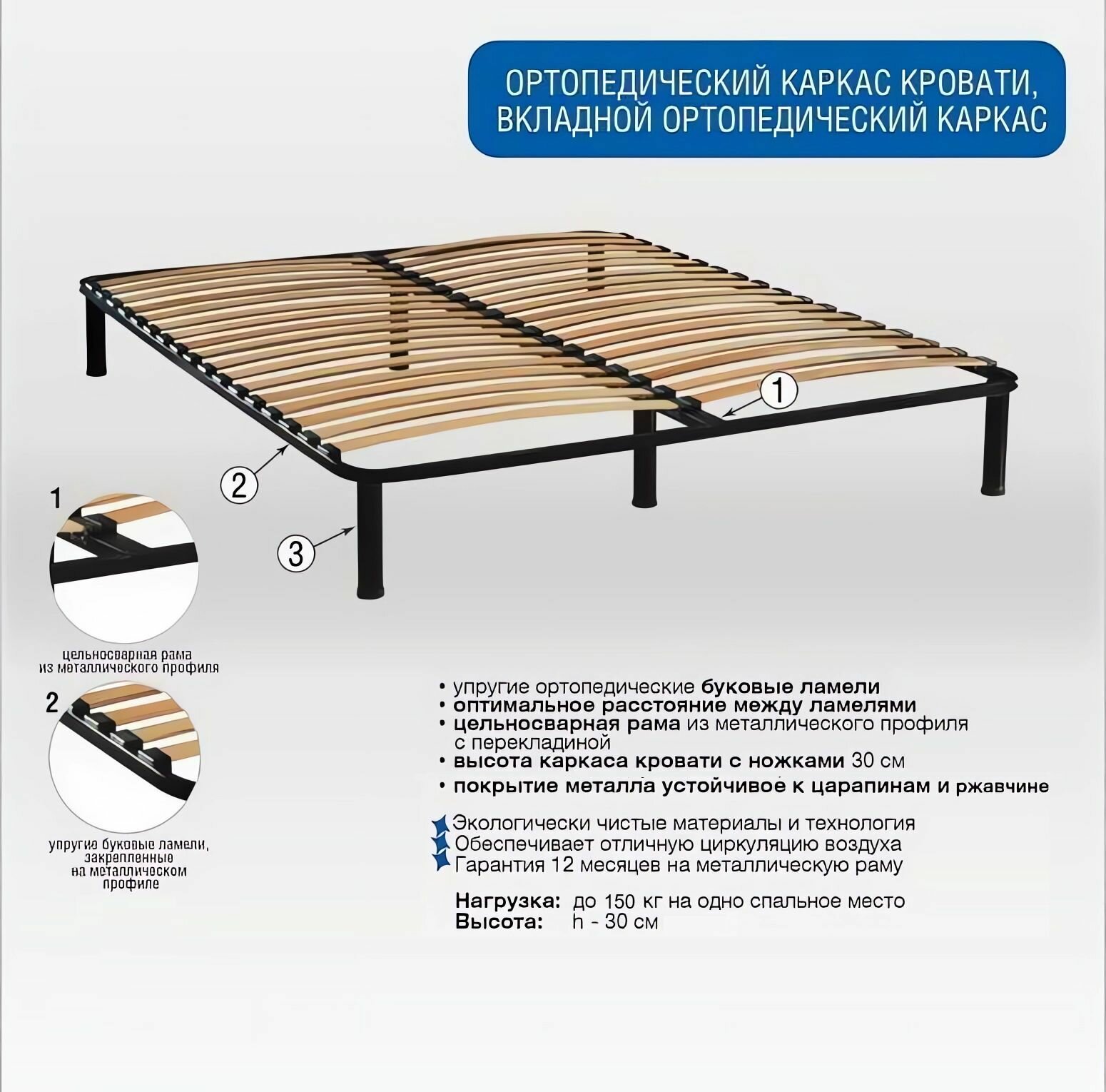 No-standard 160x200 Усиленное ортопедическое основание для кровати разборное, профиль 30х30х1,5мм, узкие ламели 60 шт.