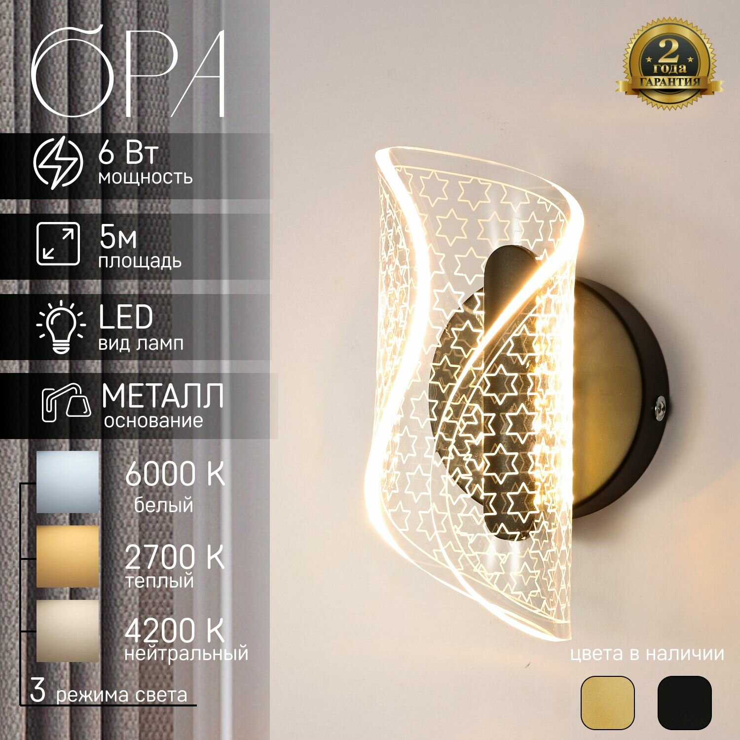 Светильник настенный, бра настенные, 6 Вт, 43 см, трехцветный меняющийся свет