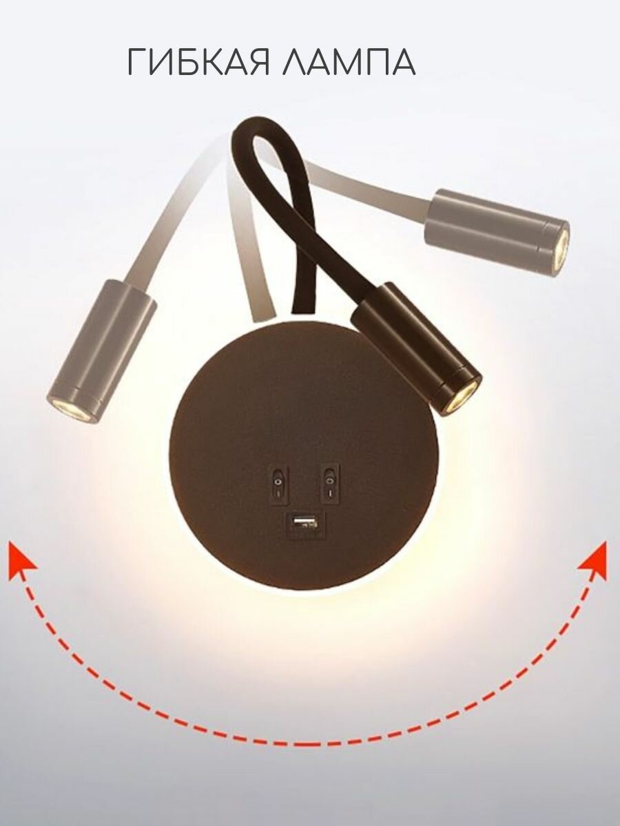 Купить Светодиодный настенный светильник Бра круглый с двумя выключателями, гибкой лампой и USB входом Черный