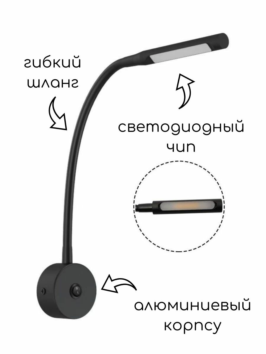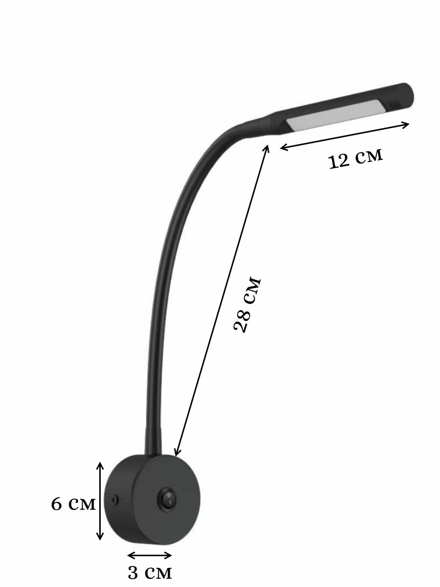Светодиодная гибкая настенная лампа на плоском основании с выключателем, Бра для спальни, гостиной, кухни Wogow Черный