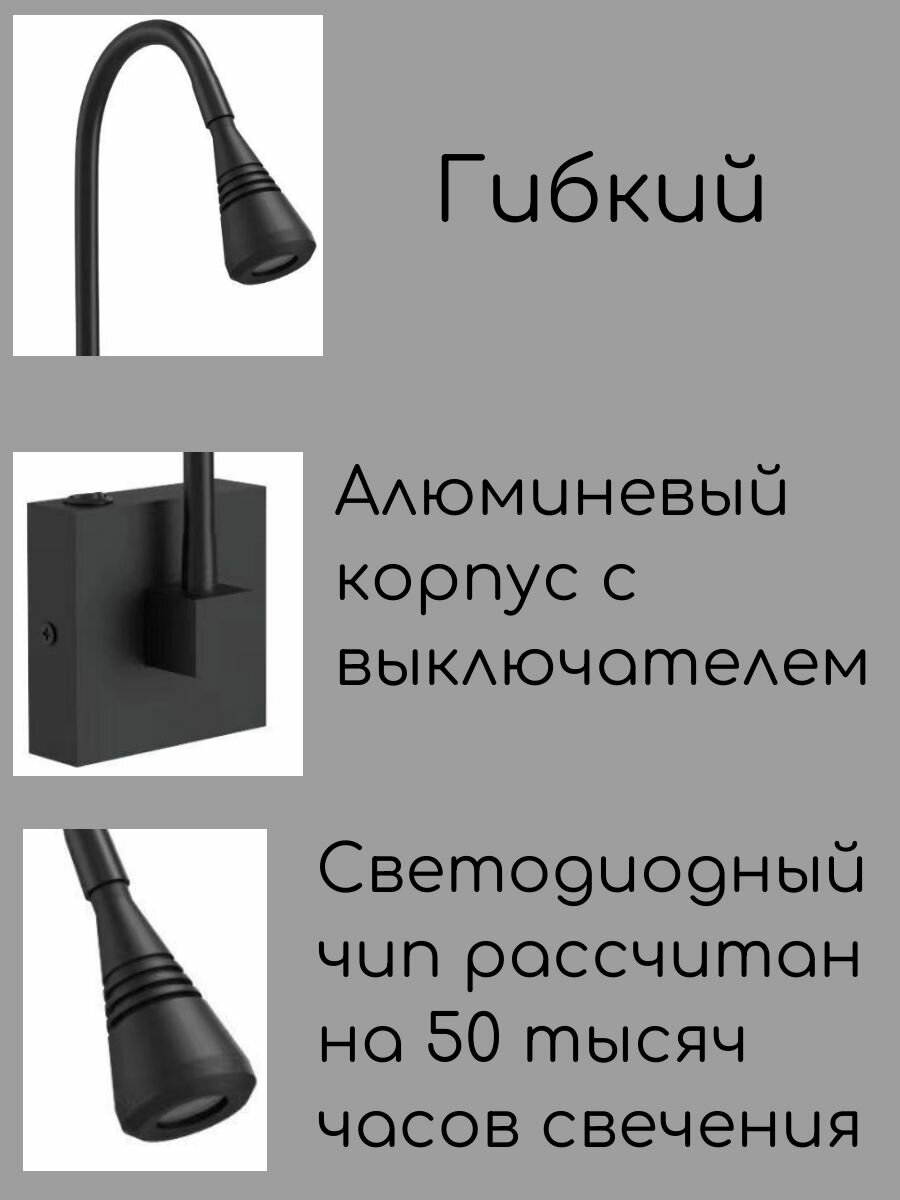 Светодиодная гибкая настенная лампа на плоском основании с выключателем, Бра для спальни, гостиной, кухни Wogow Черный