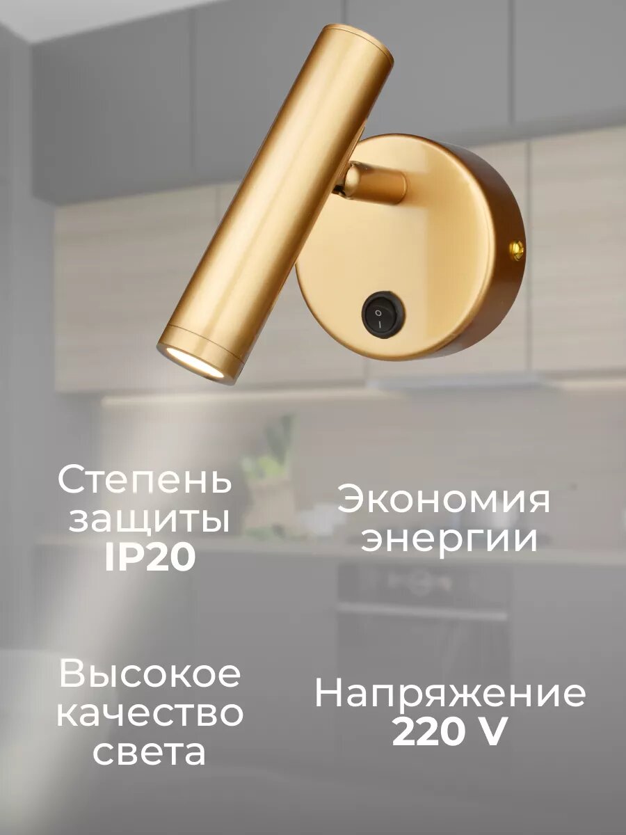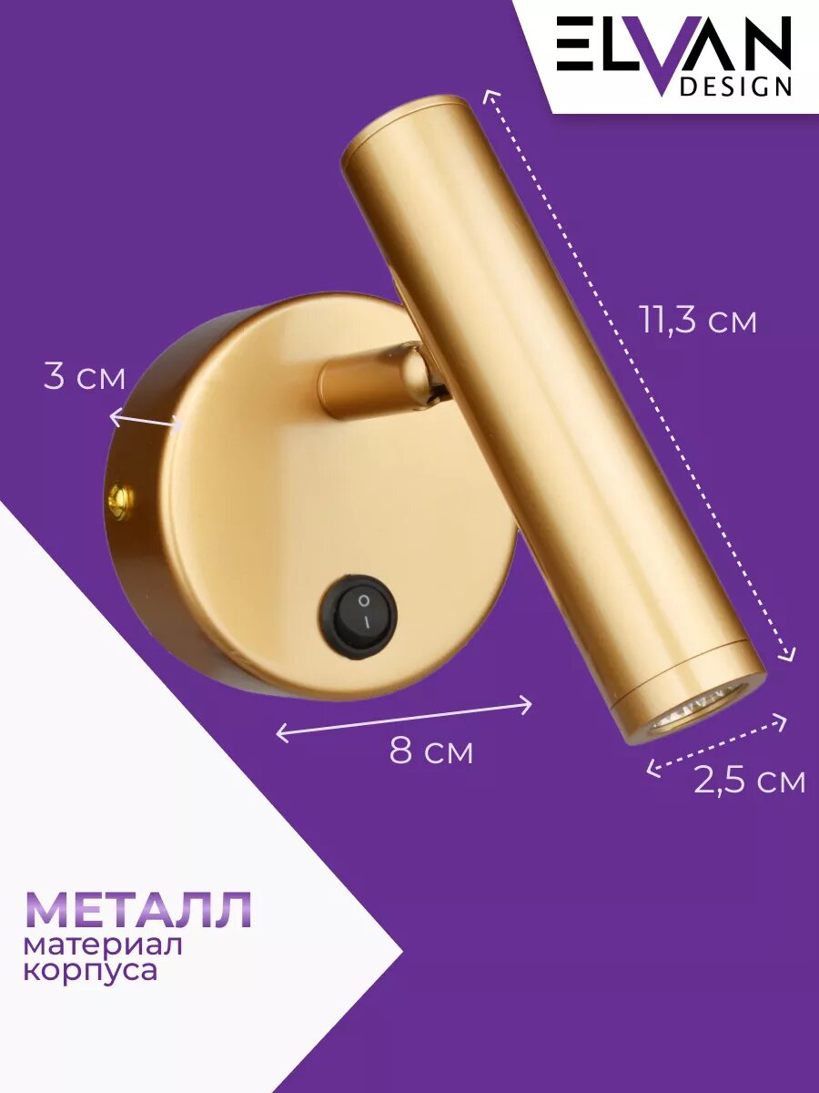 Светильник светодиодный Elvan 7713 с выключателем, 3000 К, 3 Вт, IP20, золотой интересное: