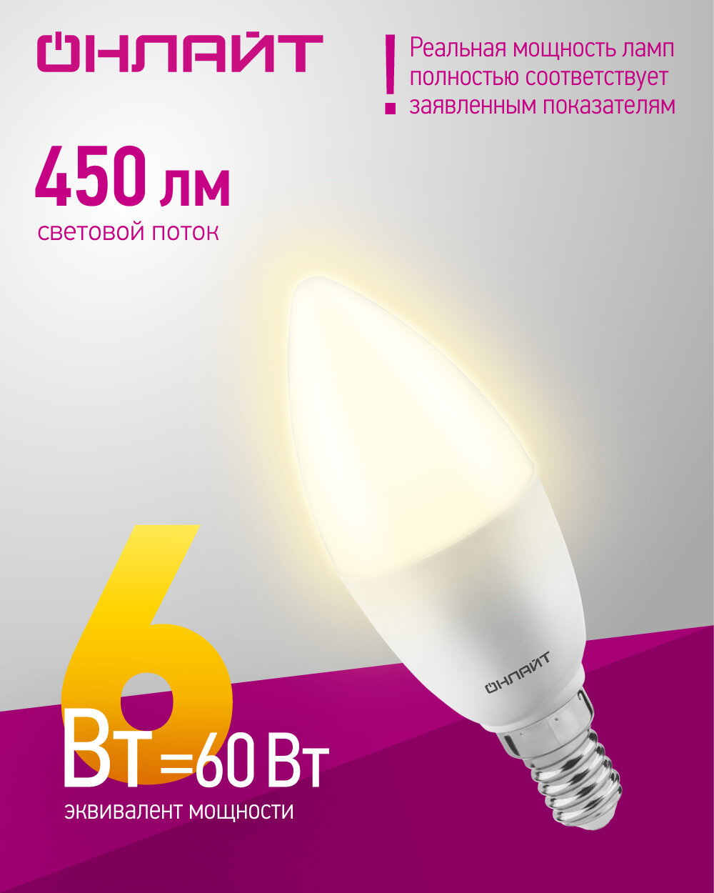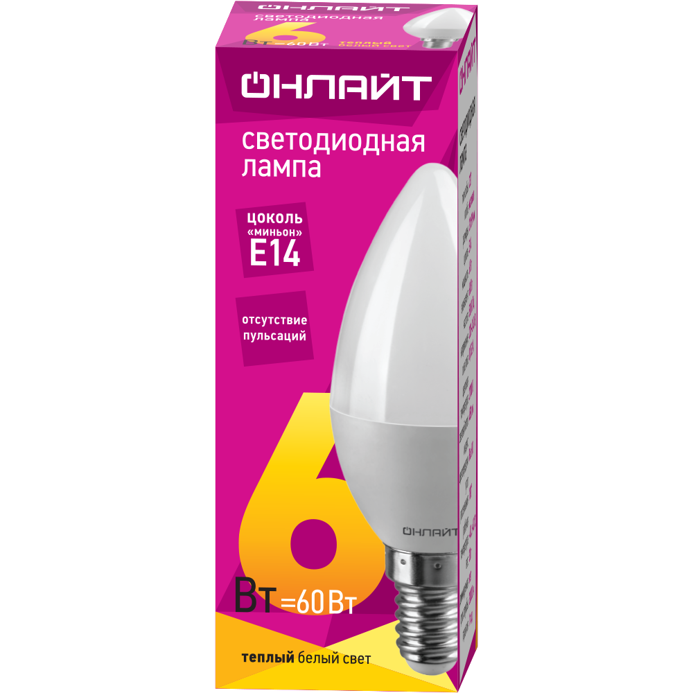 Лампа светодиодная онлайт 71 628, 6 Вт, свеча, Е14, теплый свет 2700К, упаковка 10 шт. интересное: