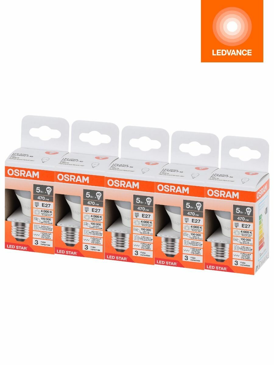 СохранитьЛампа светодиодная Е27 4000К OSRAM LED STAR, 5 шт, 5Вт, нейтральный белый свет, 470лм, колба Р40 шар матовая пластик интересное: