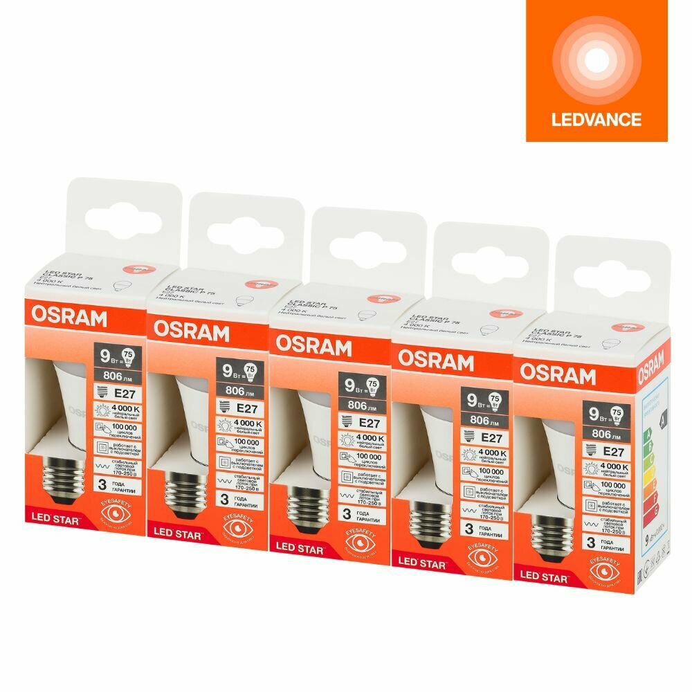 Купить Лампочки светодиодные OSRAM LED STAR, 9Вт, 5 шт в наборе, Е27, 4000К нейтральный белый свет, 806лм, колба Р шар матовая пластик