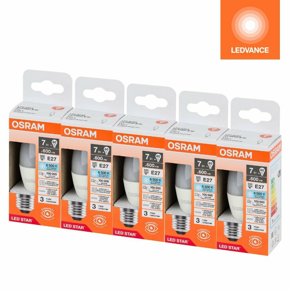 Ниже Вы можете прочитать отзывы на Лампочки светодиодные OSRAM LED STAR, 7Вт, 5 шт в наборе, Е27, 6500К холодный белый свет, 600лм, колба В свеча матовая пластик, ознакомится с подробными характеристиками, посмотреть интересные обзоры и фотографии на Лампочки светодиодные OSRAM LED STAR, 7Вт, 5 шт в наборе, Е27, 6500К холодный белый свет, 600лм, колба В свеча матовая пластик.