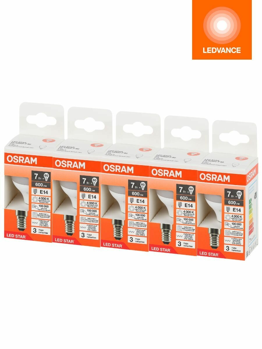 Купить Лампа светодиодная Е14 OSRAM LED STAR, 5 шт, 7Вт, 4000К нейтральный белый свет, 600лм, колба Р60 шар матовая пластик