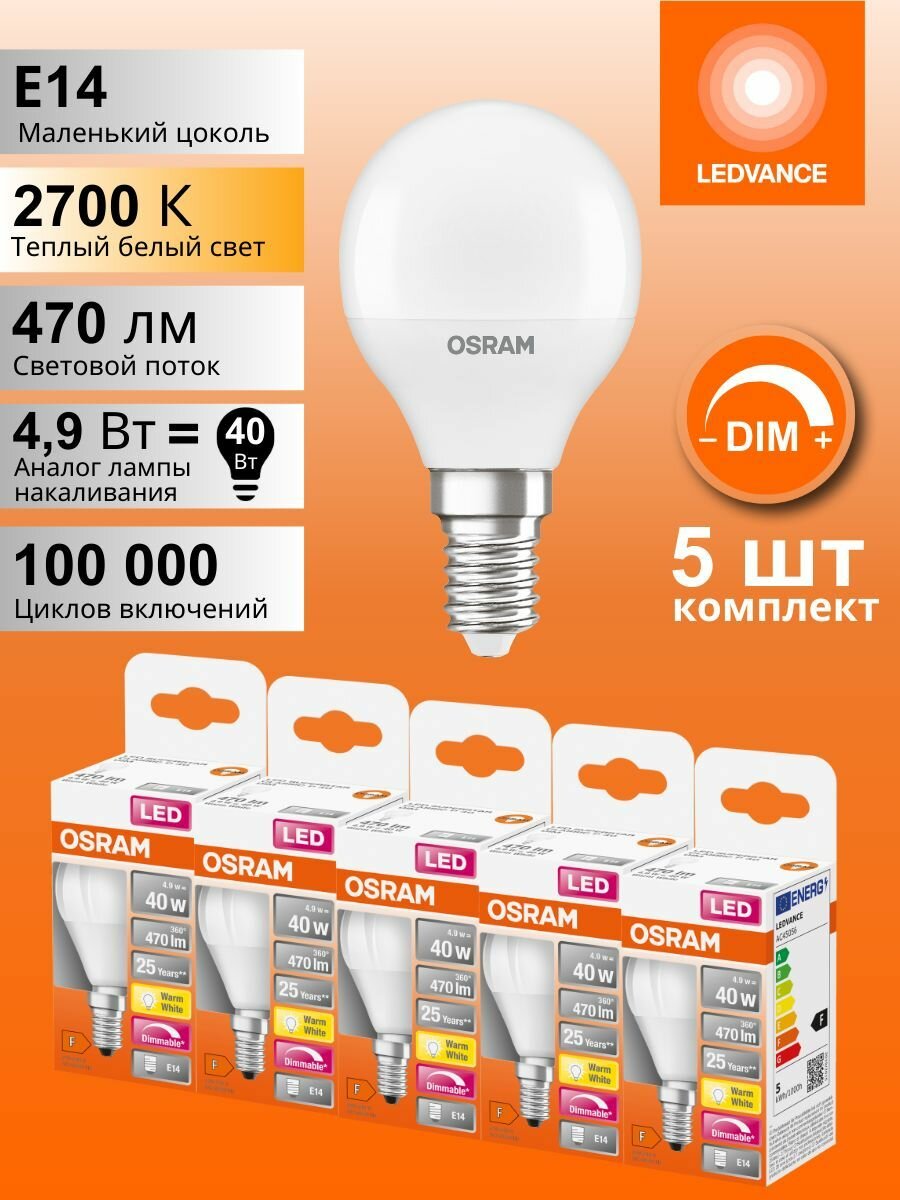 Купить Светодиодные диммируемые лампы Е14 OSRAM LED STAR, 5 шт, 4.9Вт, 2700К теплый свет, 470лм, колба Р40 шар матовая пластик