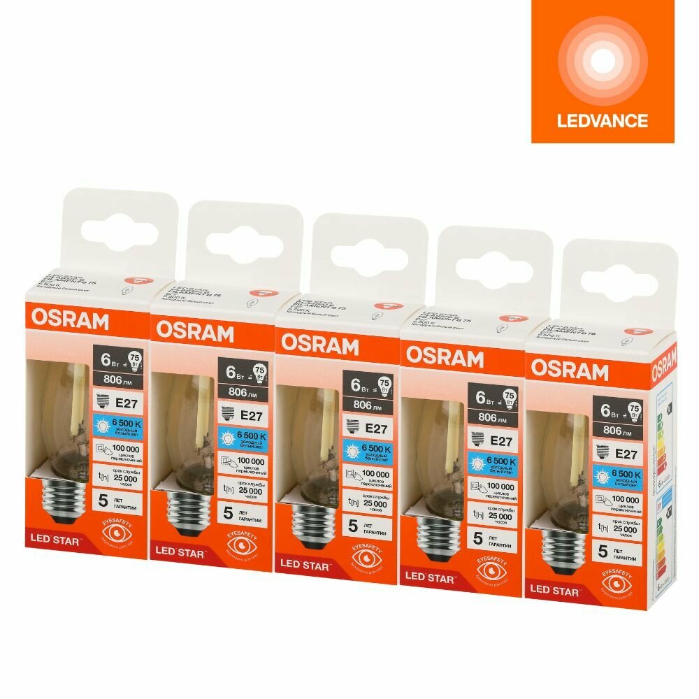 Купить Лампочки светодиодные филаментные OSRAM LED STAR, 6Вт, 5 шт в наборе, Е27, 6500К холодный белый свет, 806лм, колба В свеча прозрачная стекло