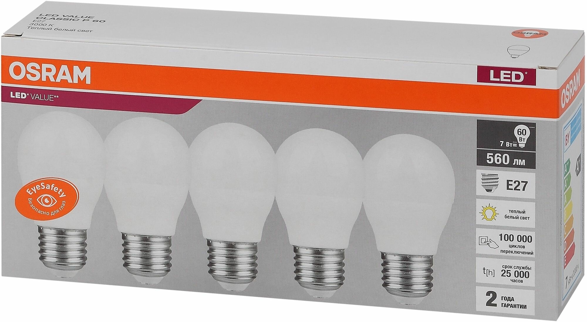 Купить Лампочка светодиодная E27 Osram, 7 Вт, 3000К, шар, 5 шт