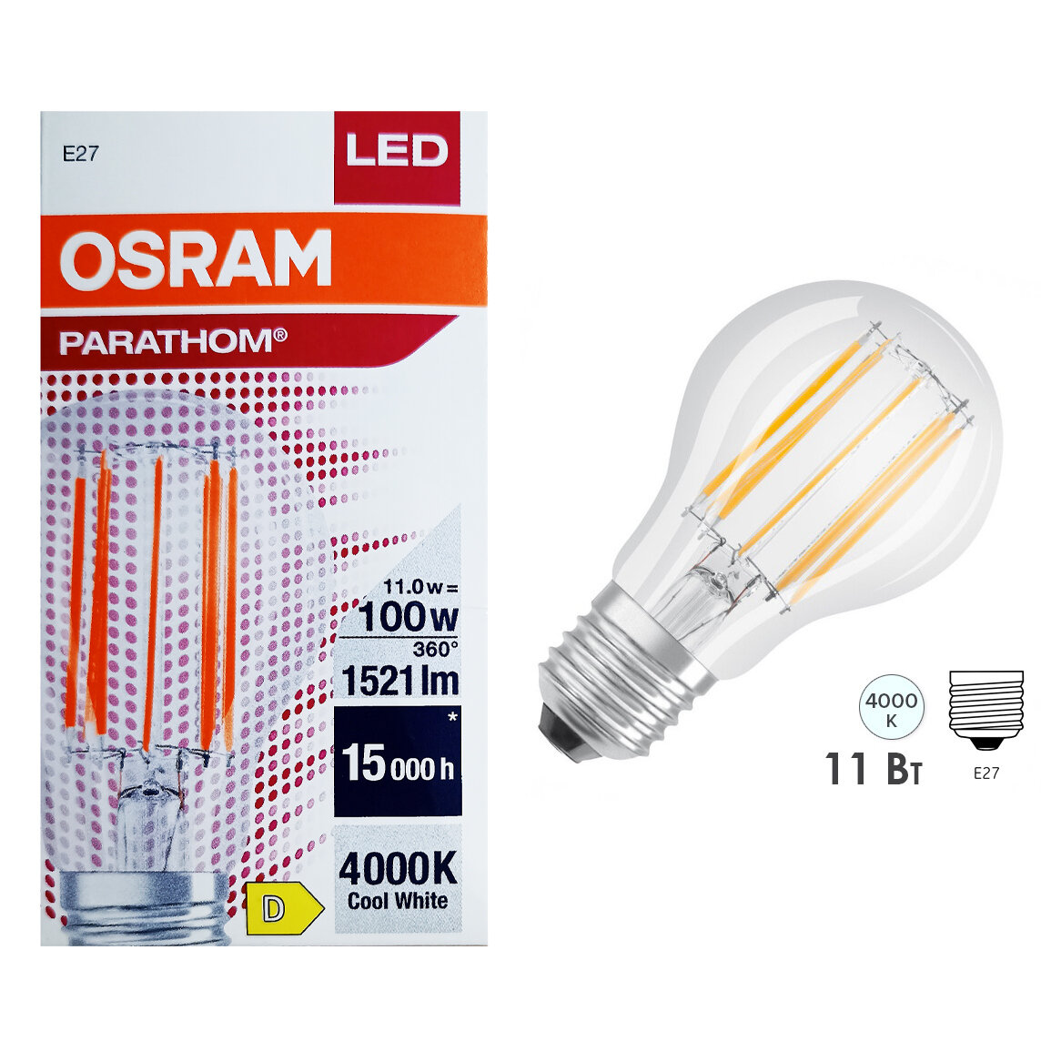 Купить 5шт/уп. Лампа LED Груша 11Вт 220-240В E27 1521Лм 4000К Угол 300 град. d 60mm h 105mm Филаментная Стекло Свет Дневной белый Osram, уп. 5шт