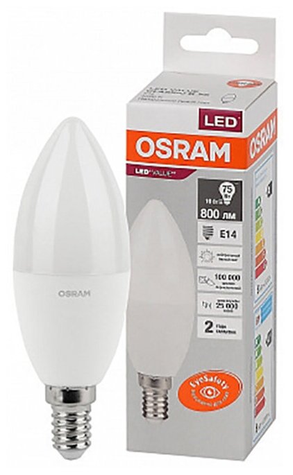 Купить 10шт/уп. Лампа LED Свечка 10Вт 220-240V E14 800Лм 4000К Угол 200 град. D-39mm L-114mm Свет Дневной белый OSRAM, уп. 10шт