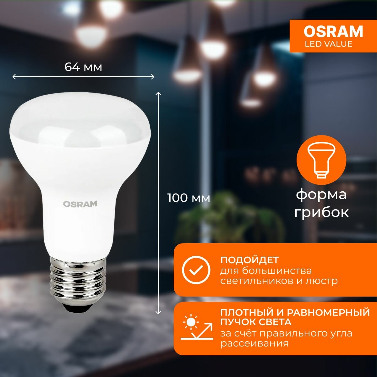 10шт/уп. Лампа LED Грибок 8Вт 220-240V E27 R63 640Лм 6500К Угол 110 град. D-63mm L-100mm Свет Холодный белый OSRAM, уп. 10шт